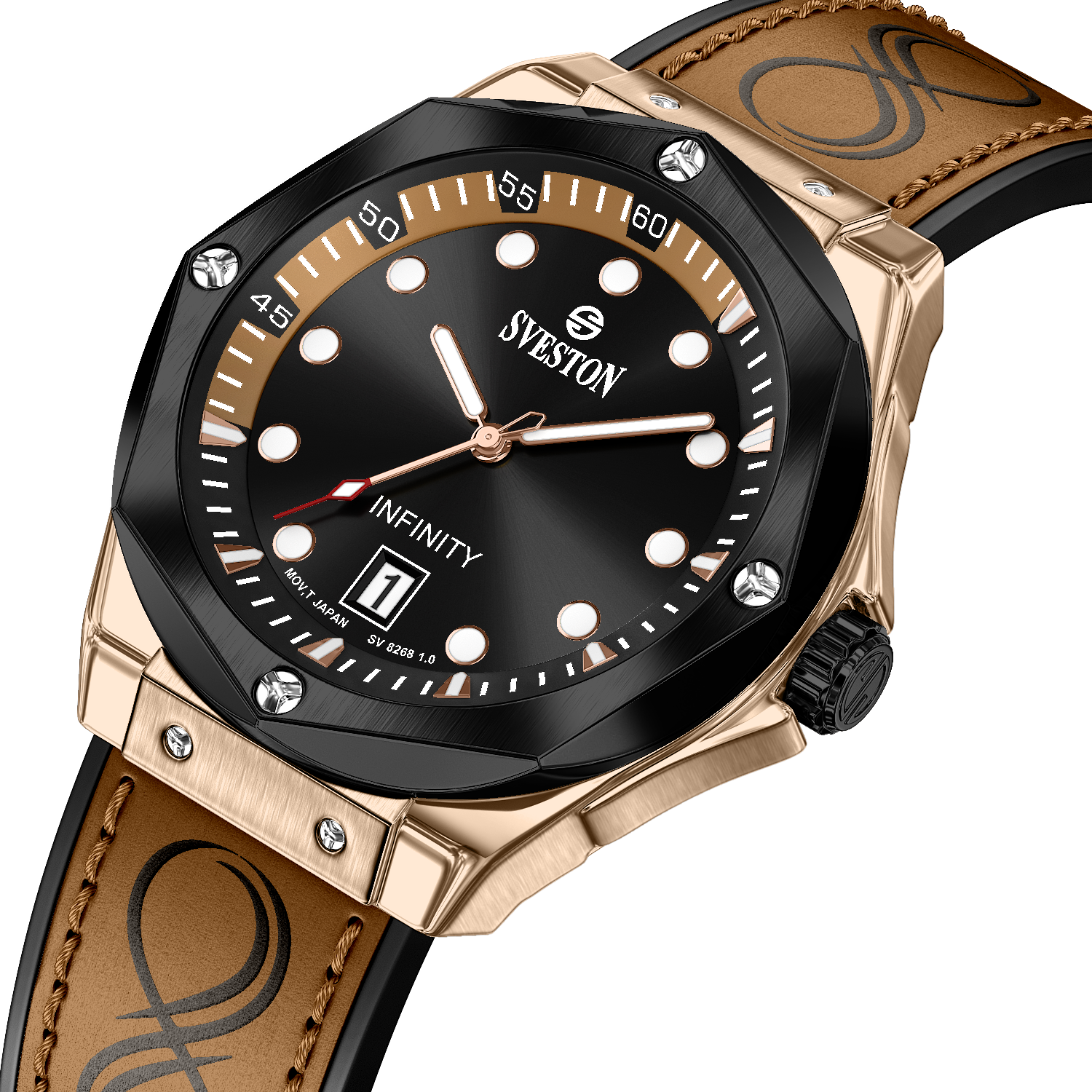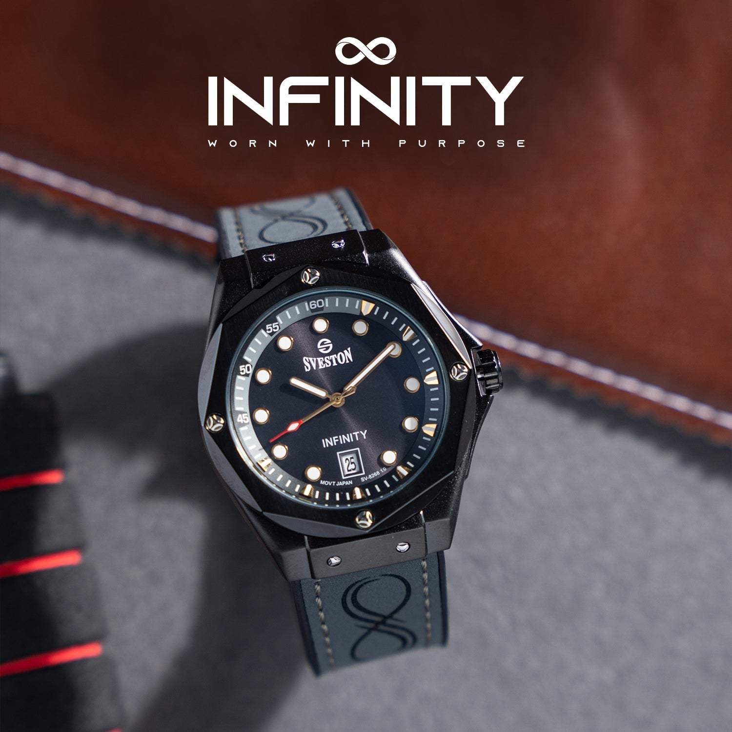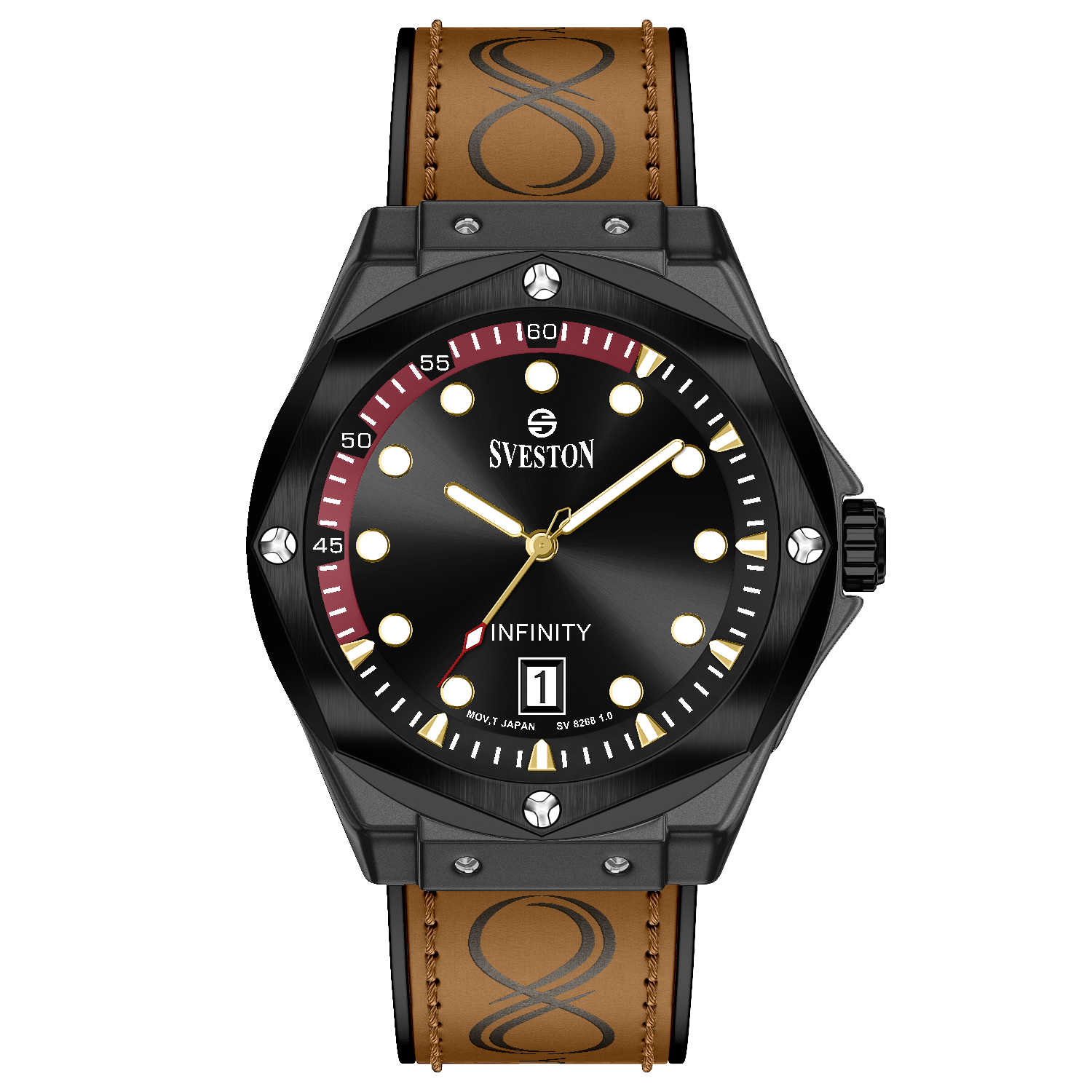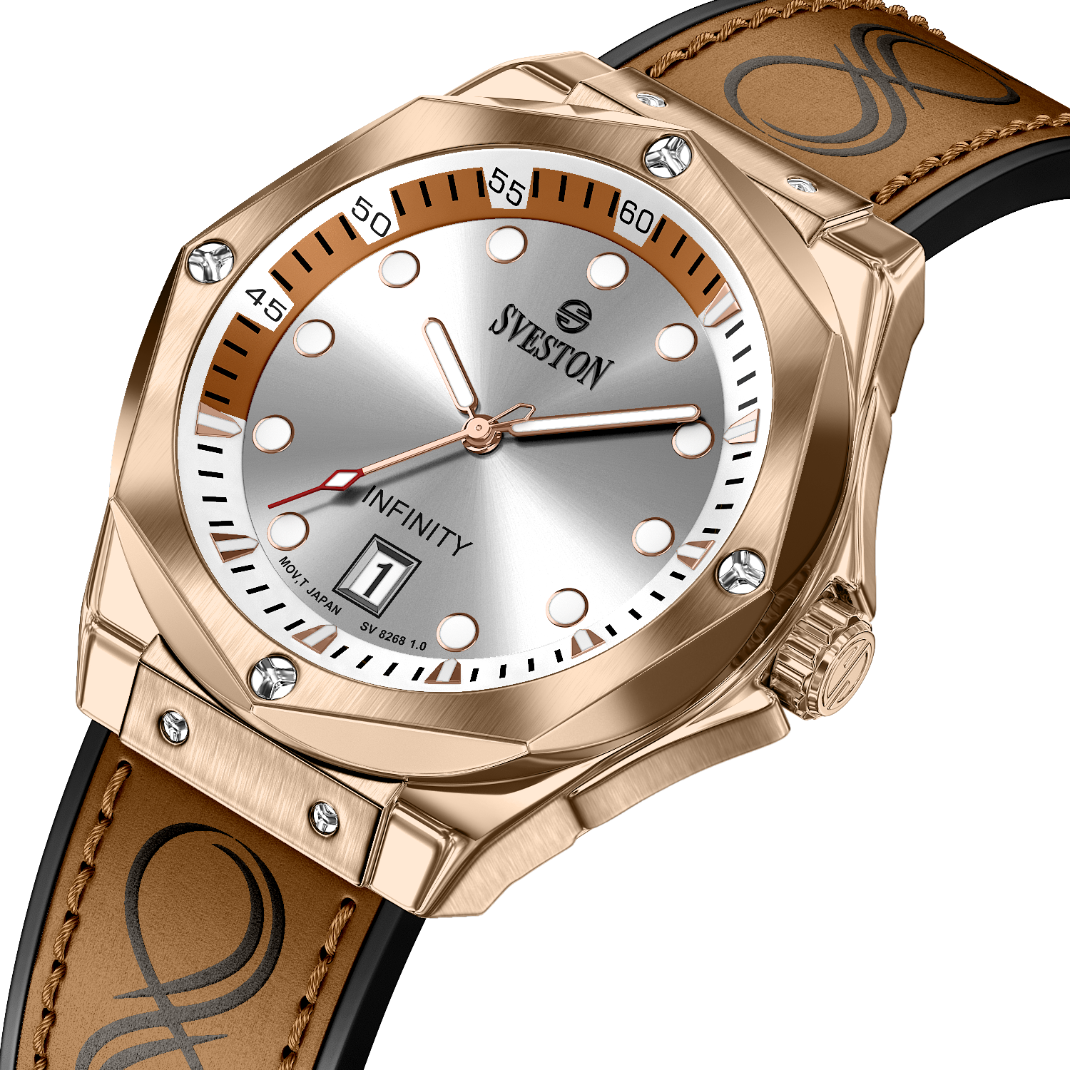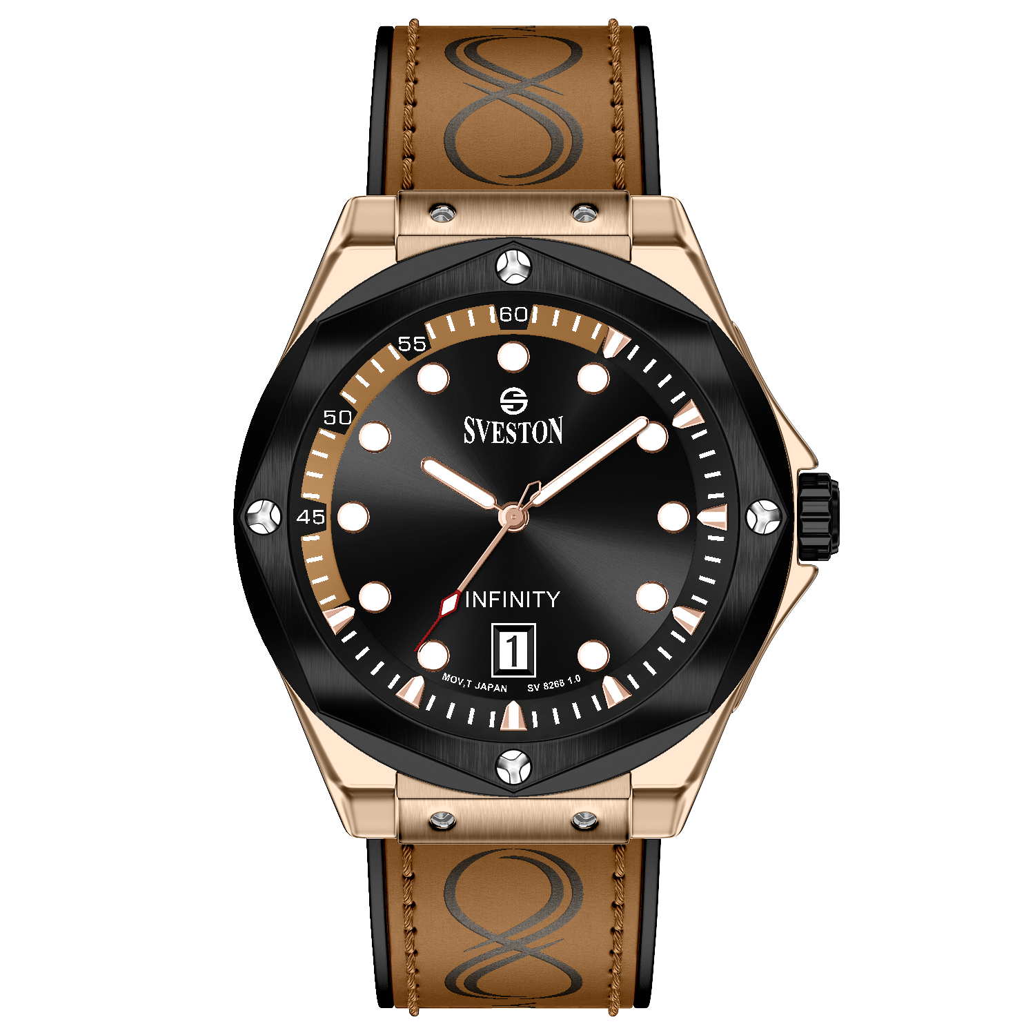 Sveston Infinity is a men's sports watch with a Rubber strap. It has a bold 39mm dial and comes in a high-quality luxury watch case. Designed for lasting style and daily comfort, it combines elegance and practicality.