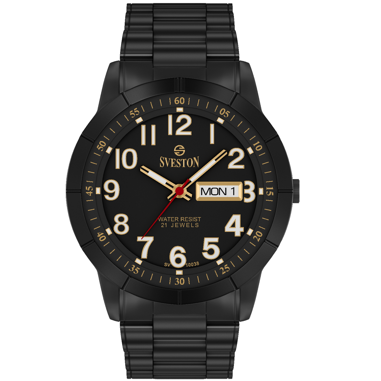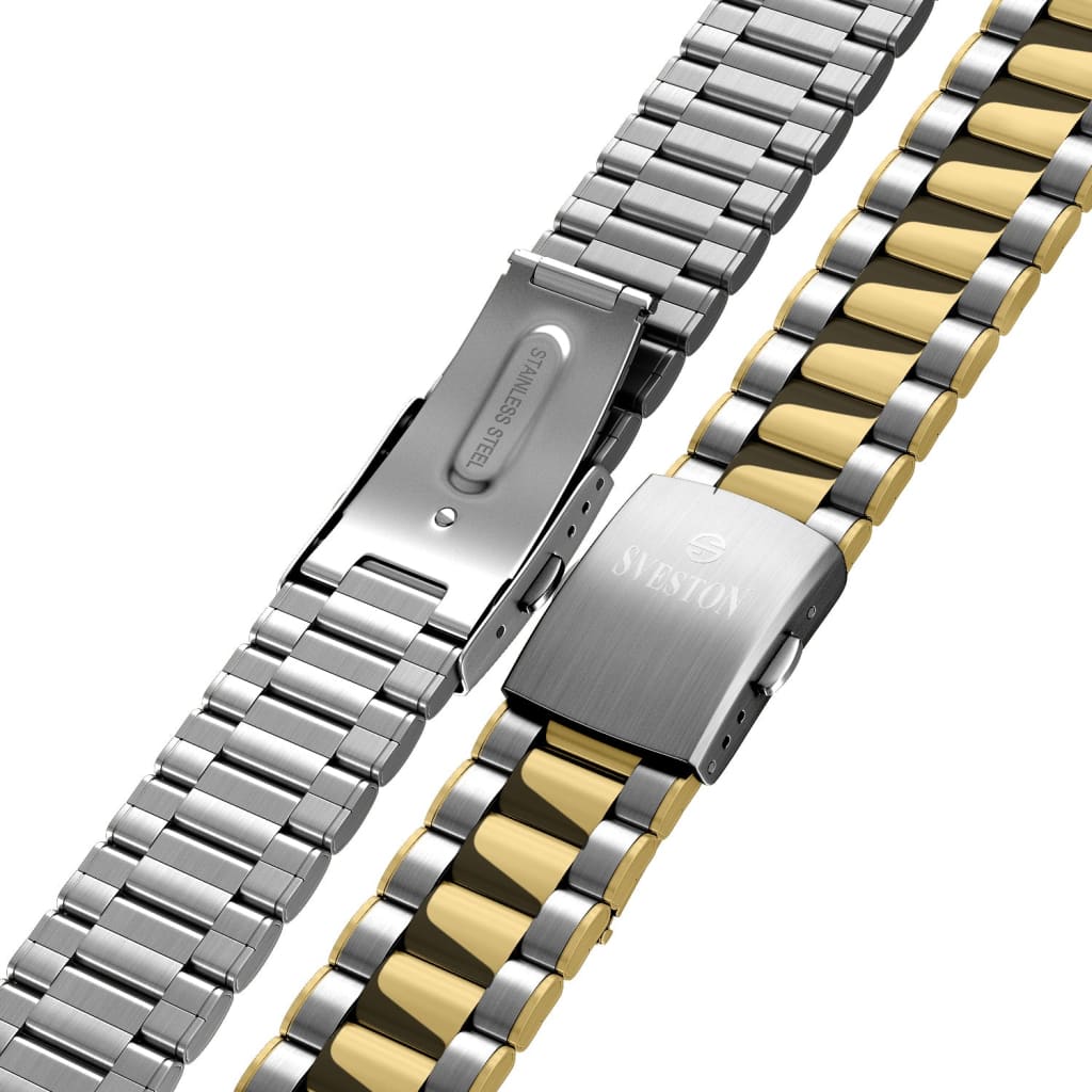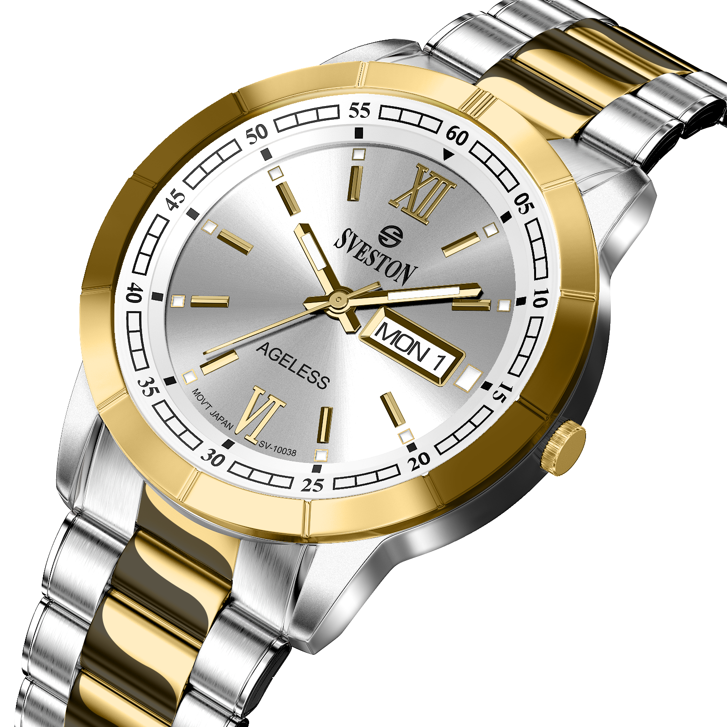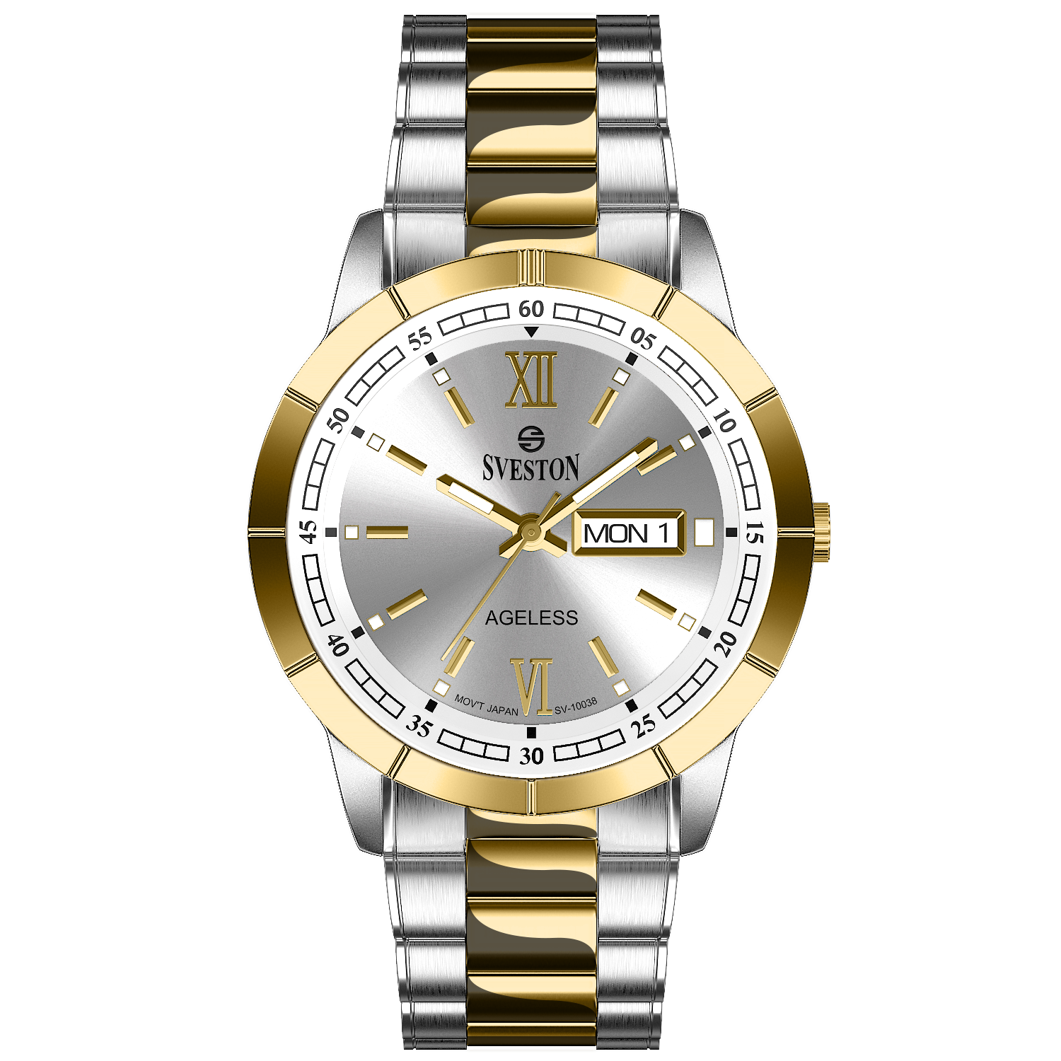 Sveston Ageless Merced is a analog battery powered 3 hand wrist watch features a 38mm round case on a link strap with pushbutton deployment clasp functions include hours minutes small seconds and date window on the right this watch comes complete with box and 1 year international warranty