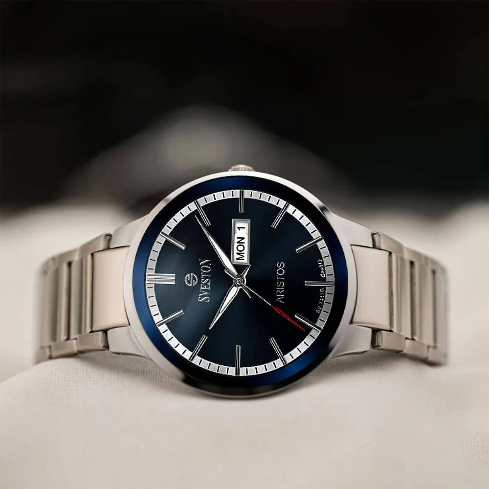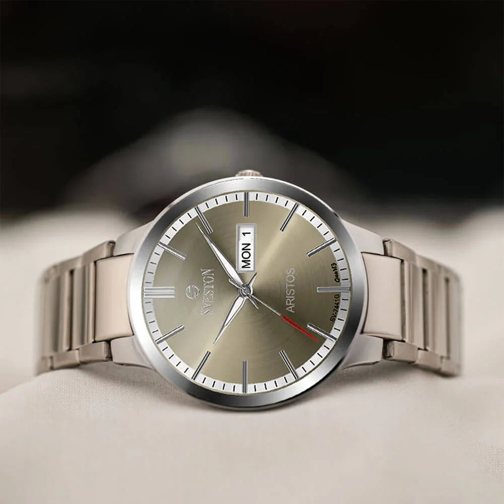 Discover the ultimate combination of style and function with the Aristos watch for men made with Japanese Quartz this stainless steel watch boasts a case size of 38mm and a lug-to-lug distance of 45mm while weighing only 113 gram With 3ATM water resistance it's the perfect watch for any occasion.
