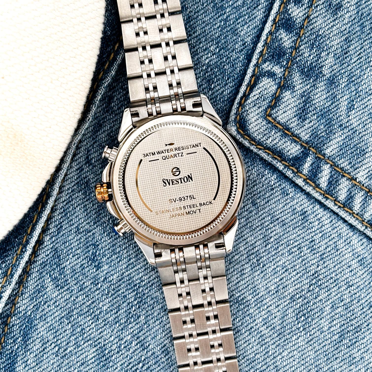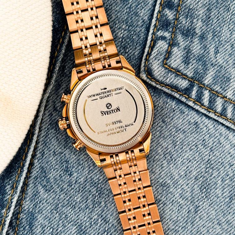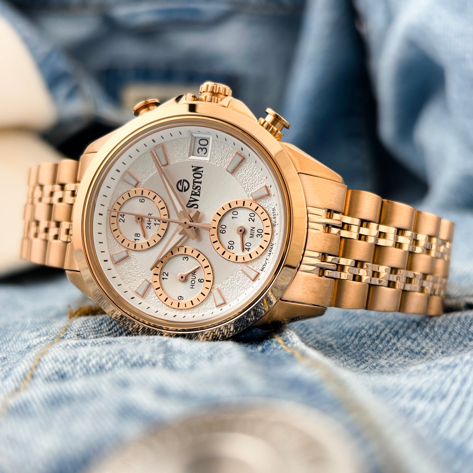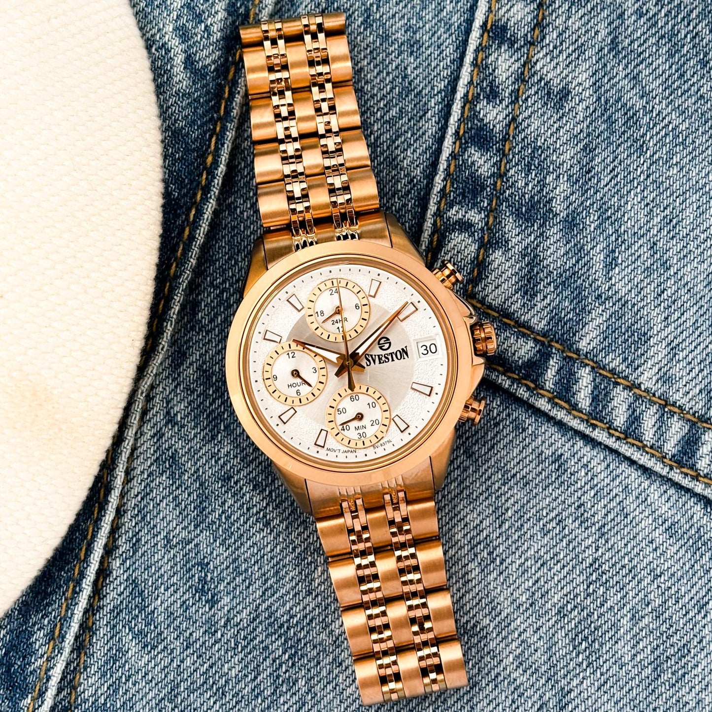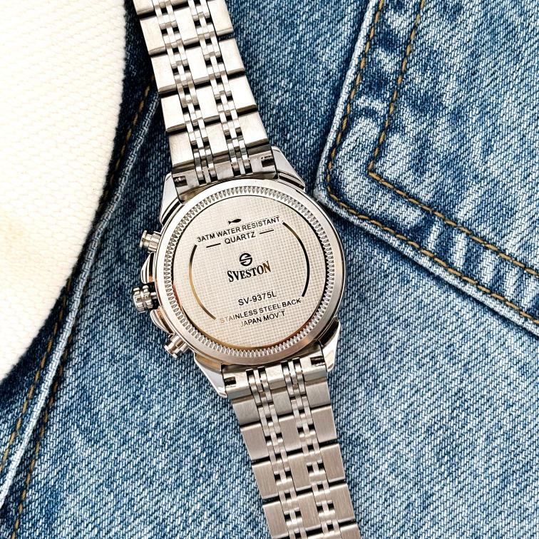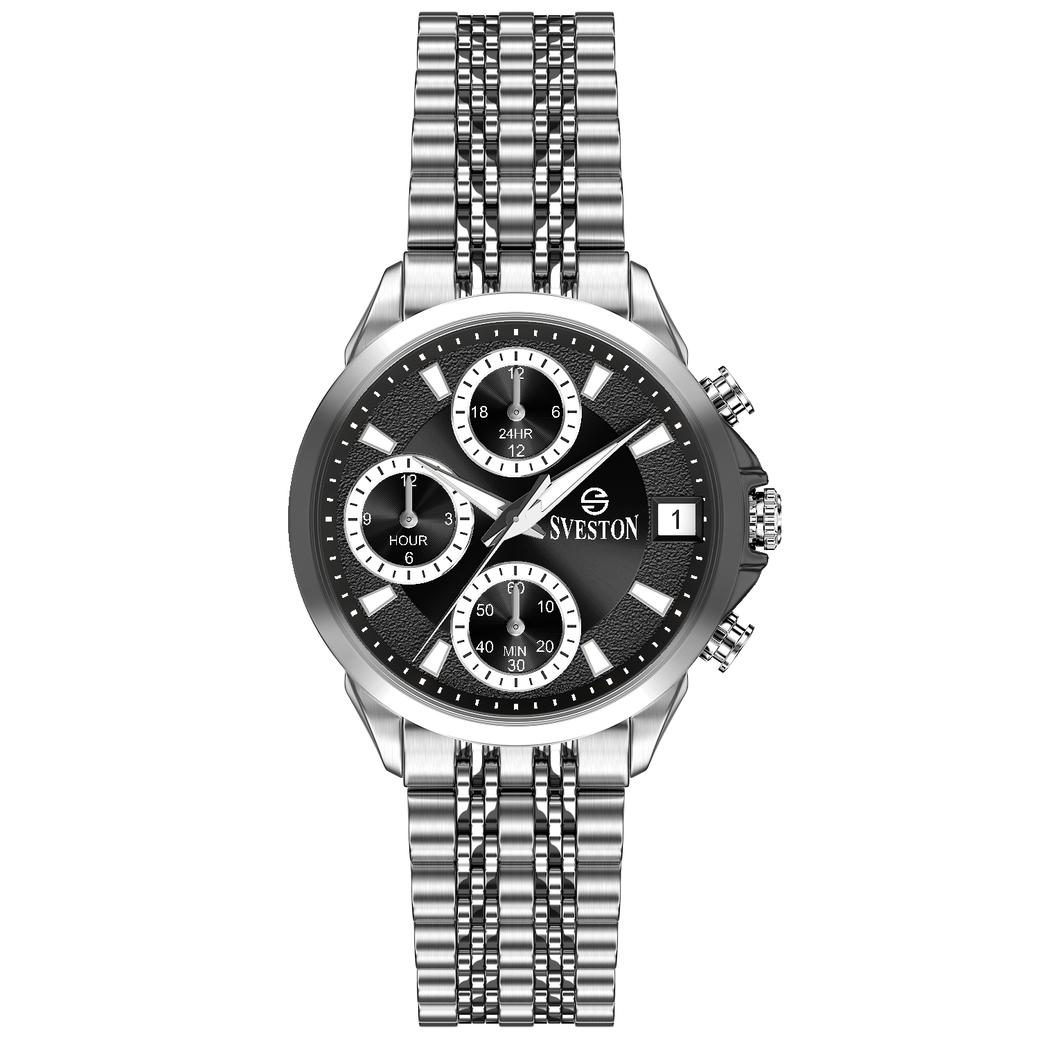 Sveston Elara is an analog, battery-powered chronograph 3-hand wristwatch, featuring a 31mm round case on a link stainless steel with a fold-over deployment clasp. Functions include hours, minutes, and small seconds. This watch comes complete with a luxury box and a 1-year international warranty.