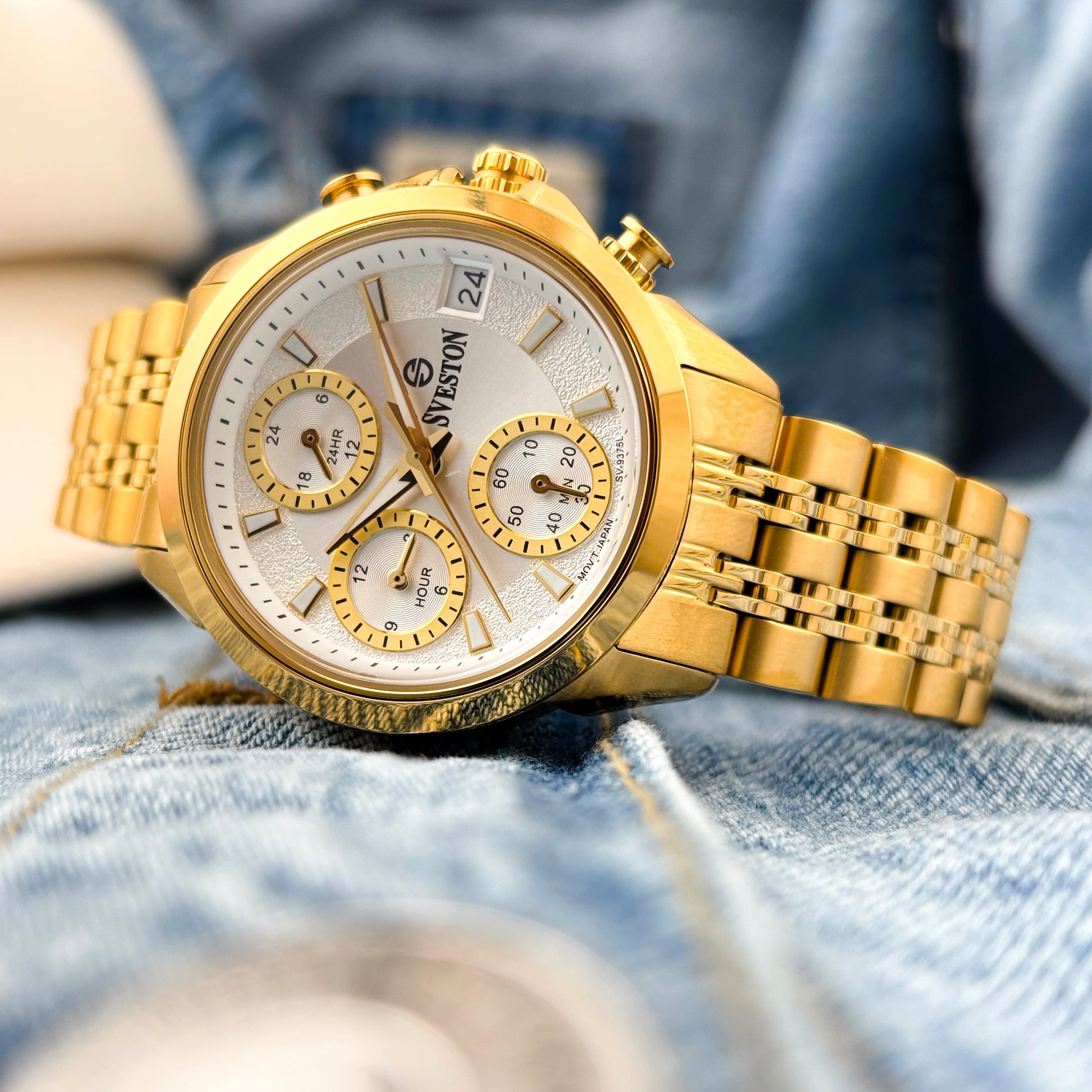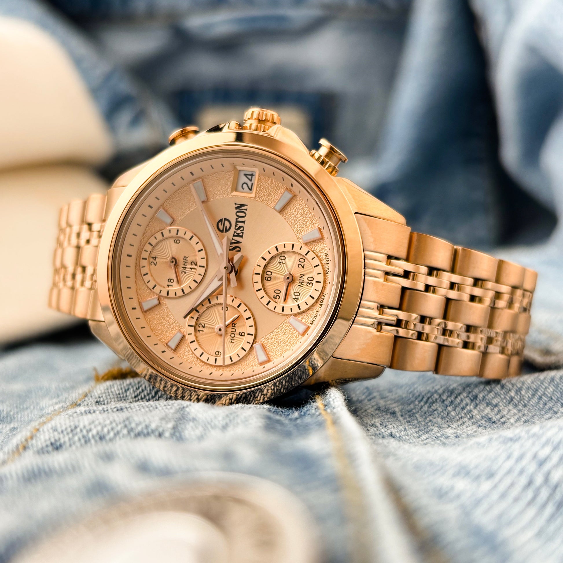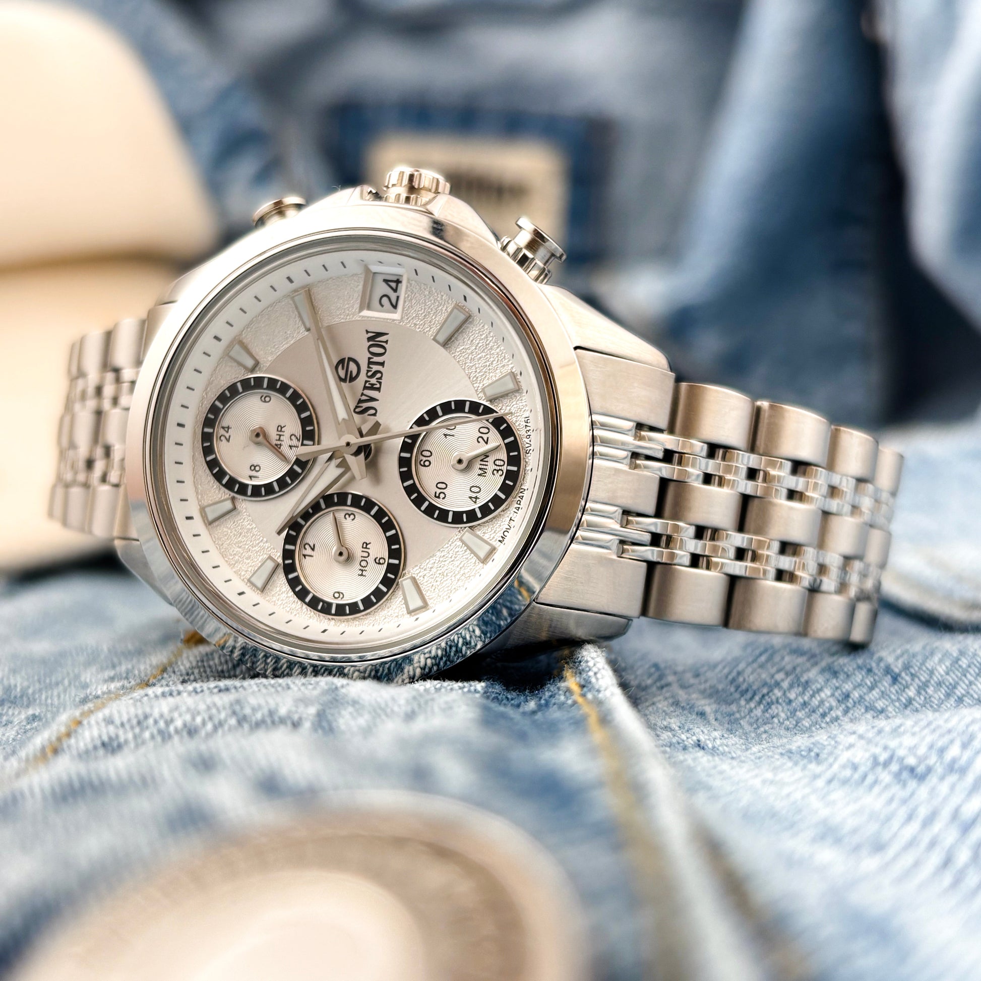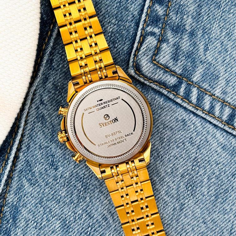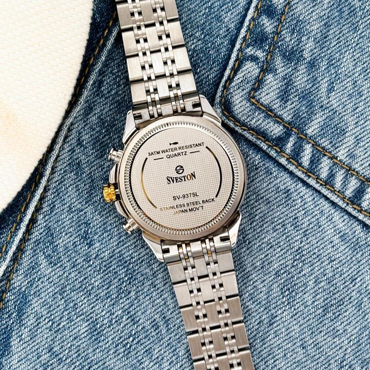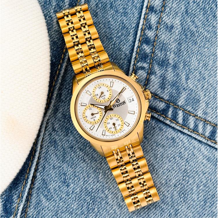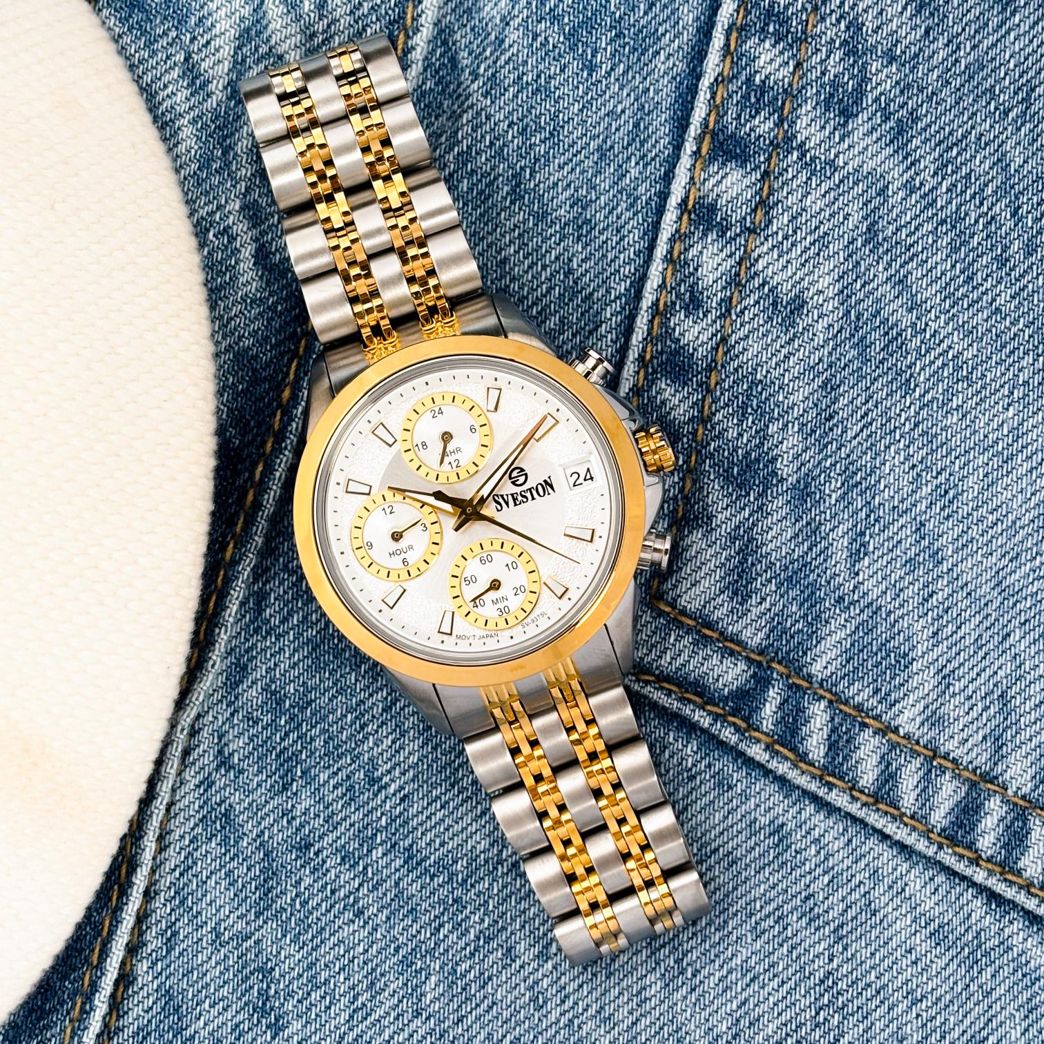 Sveston Elara is an analog, battery-powered chronograph 3-hand wristwatch, featuring a 31mm round case on a link stainless steel with a fold-over deployment clasp. Functions include hours, minutes, and small seconds. This watch comes complete with a luxury box and a 1-year international warranty.