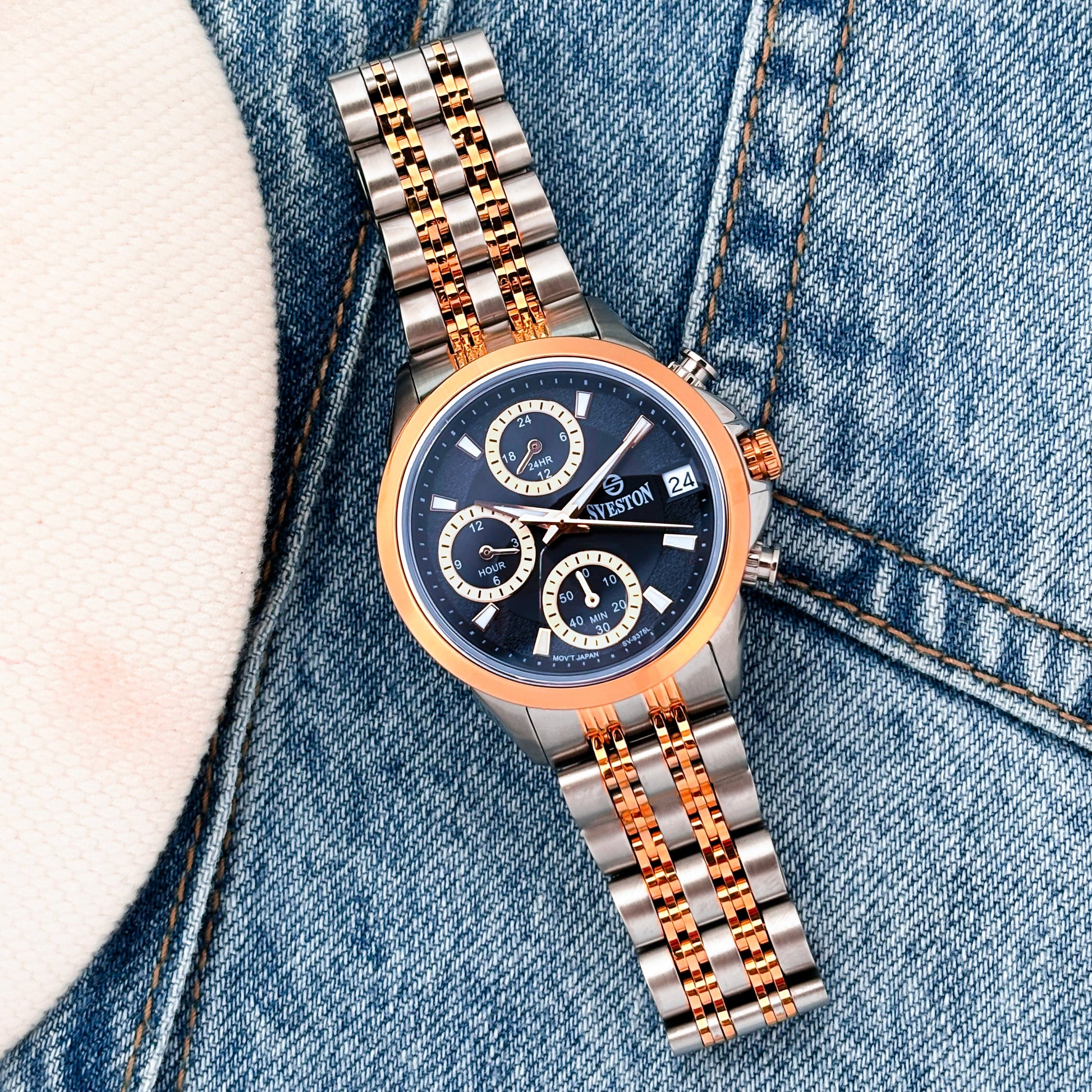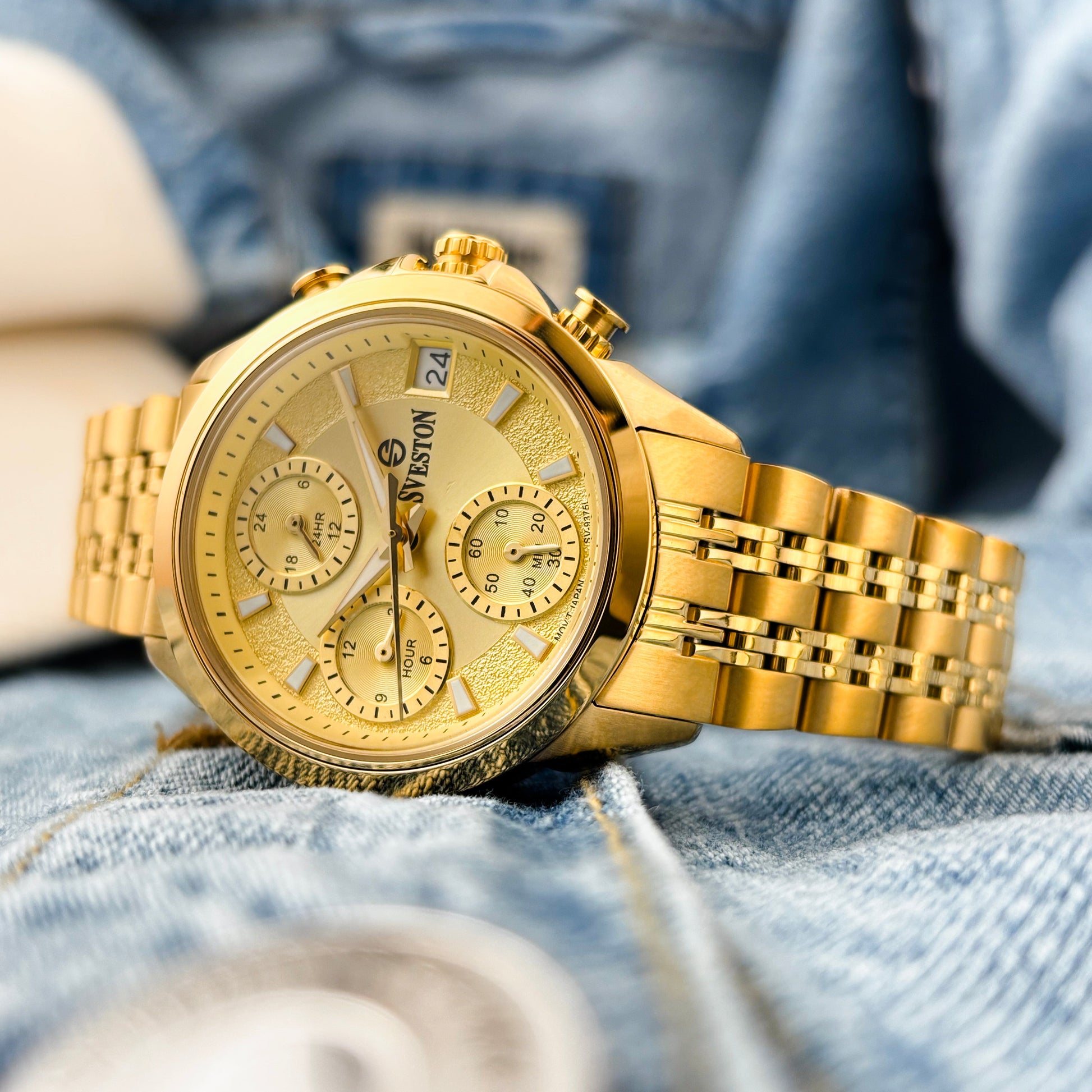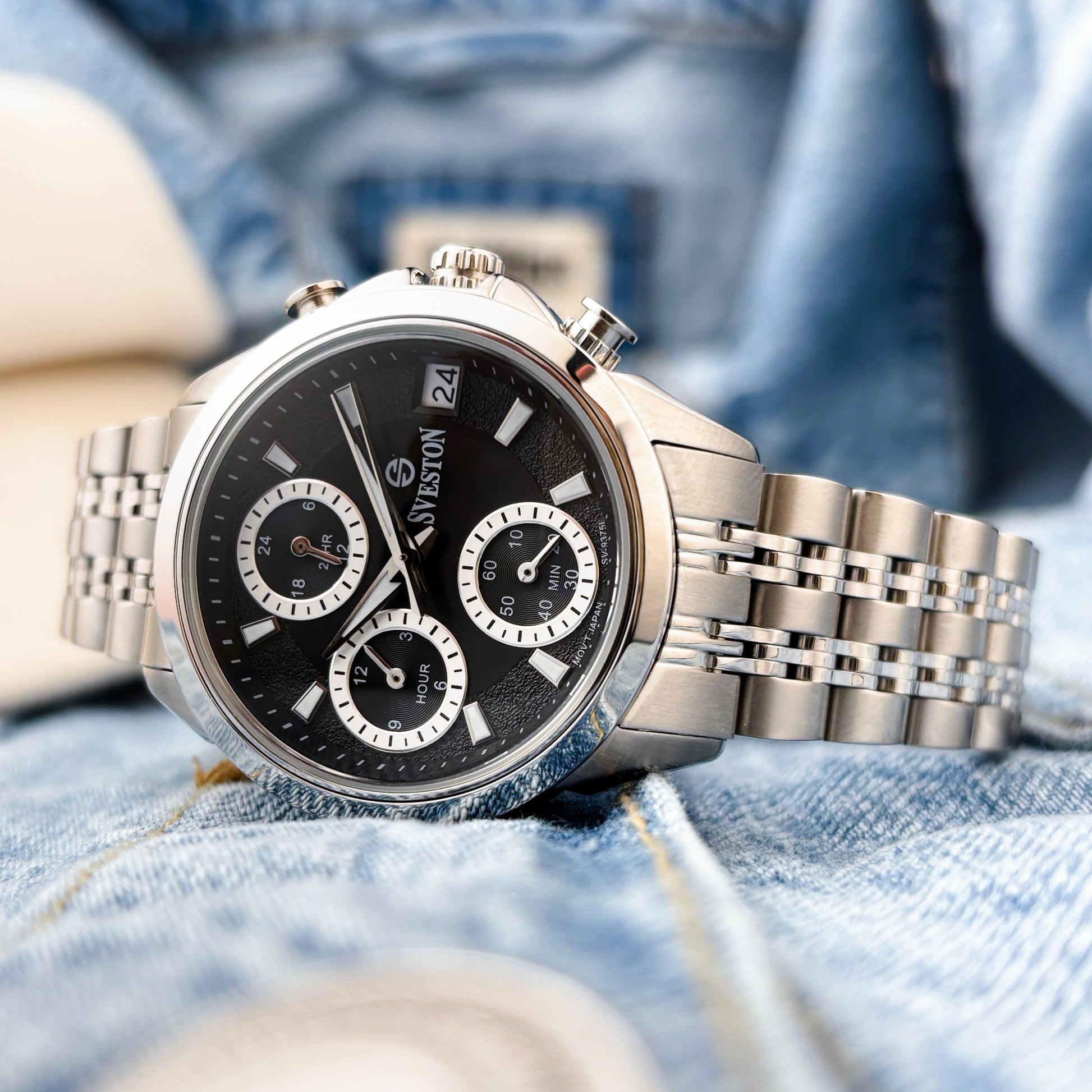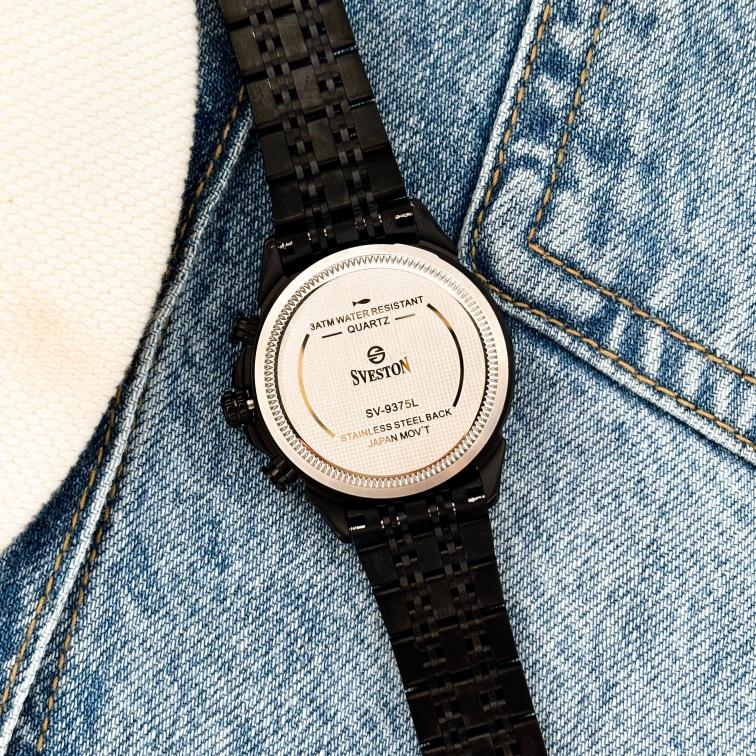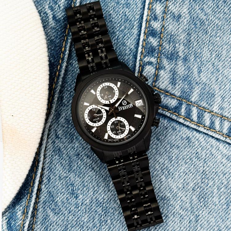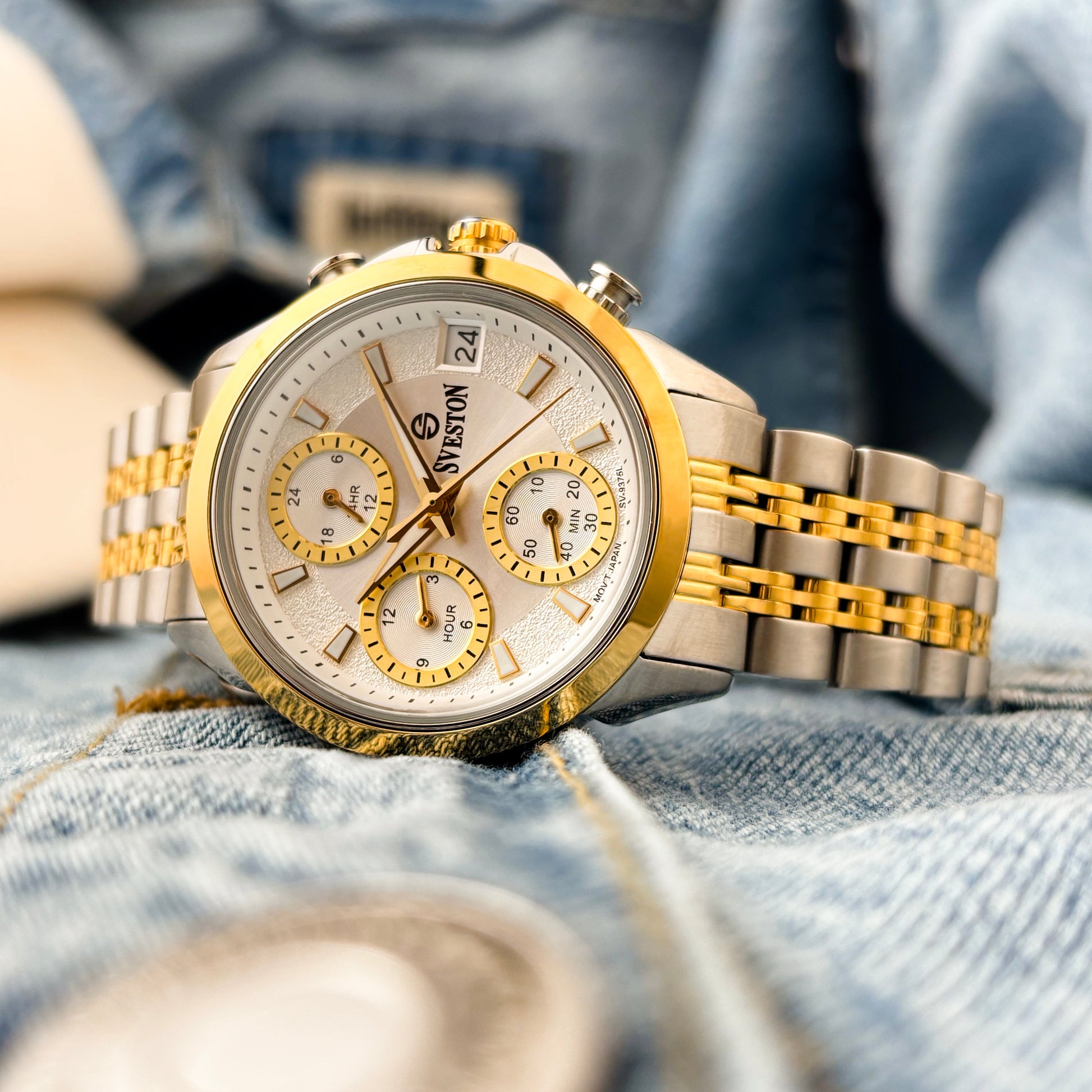 Sveston Elara is an analog, battery-powered chronograph 3-hand wristwatch, featuring a 31mm round case on a link stainless steel with a fold-over deployment clasp. Functions include hours, minutes, and small seconds. This watch comes complete with a luxury box and a 1-year international warranty.