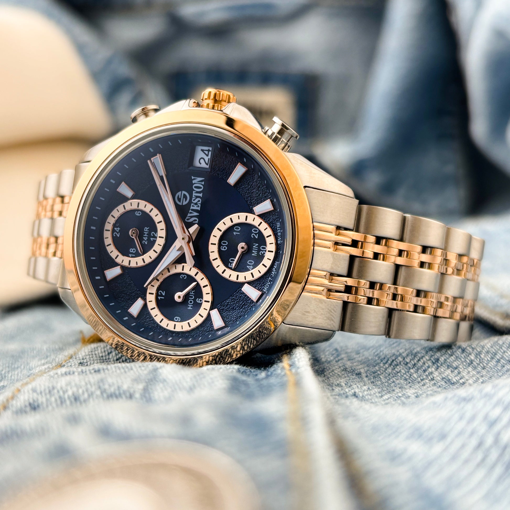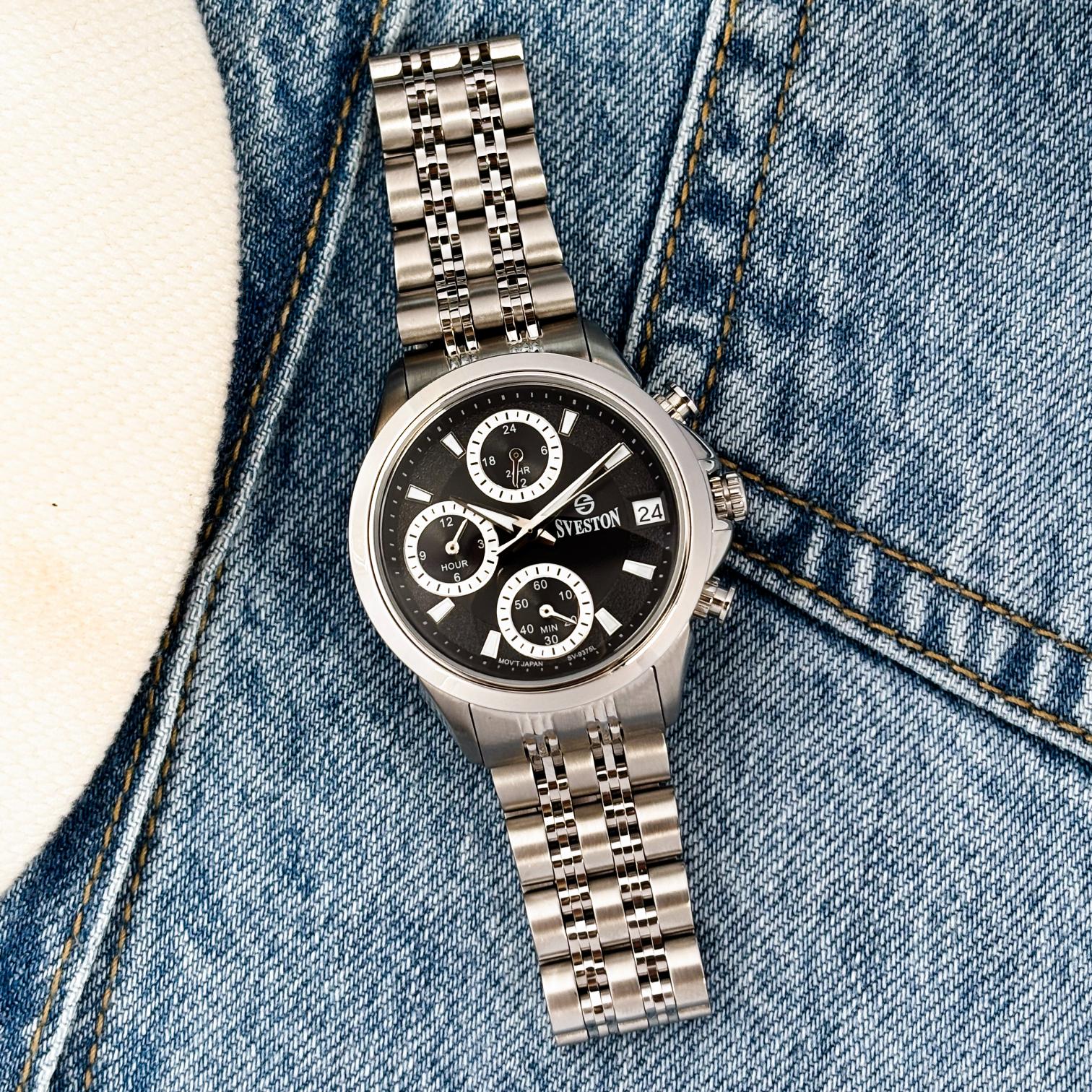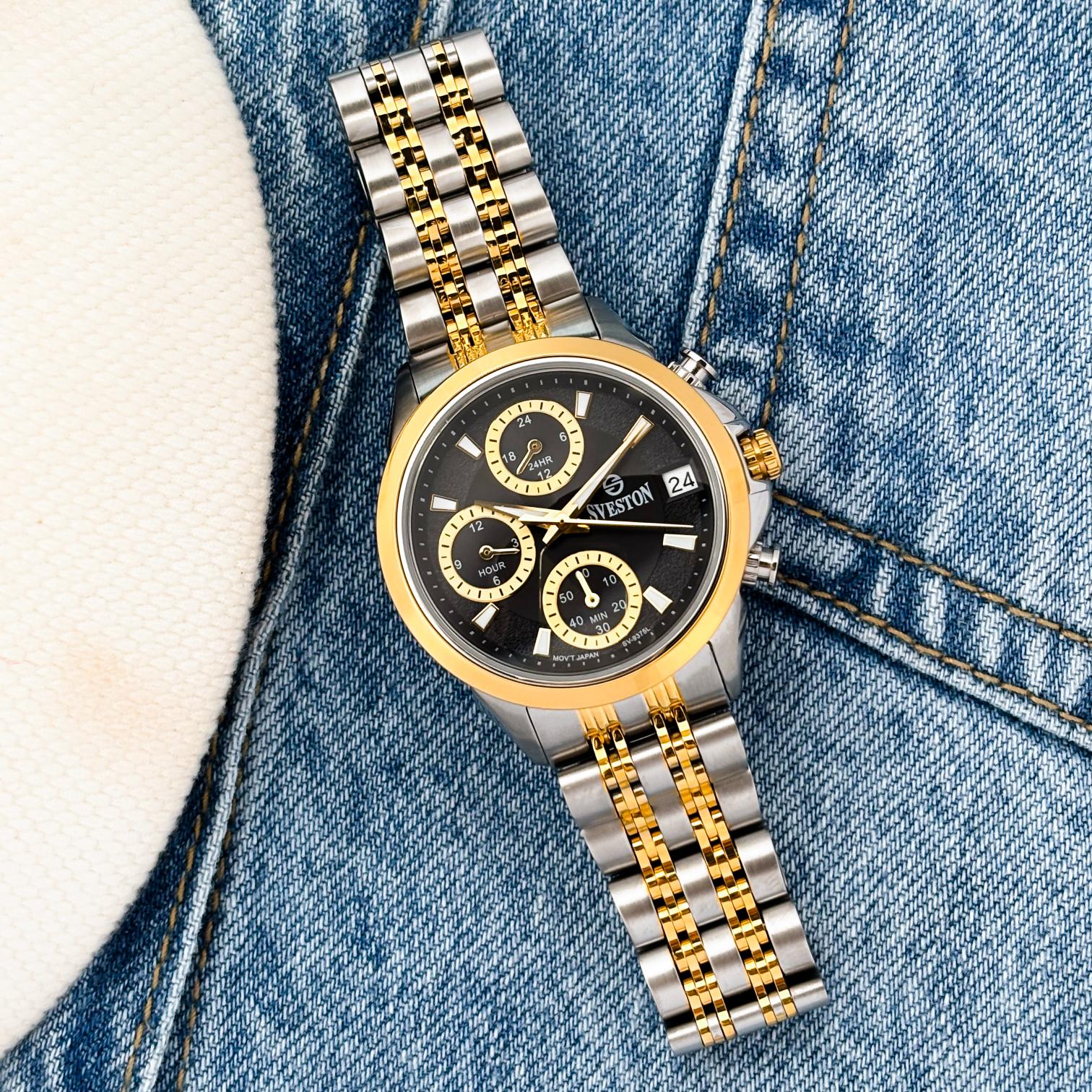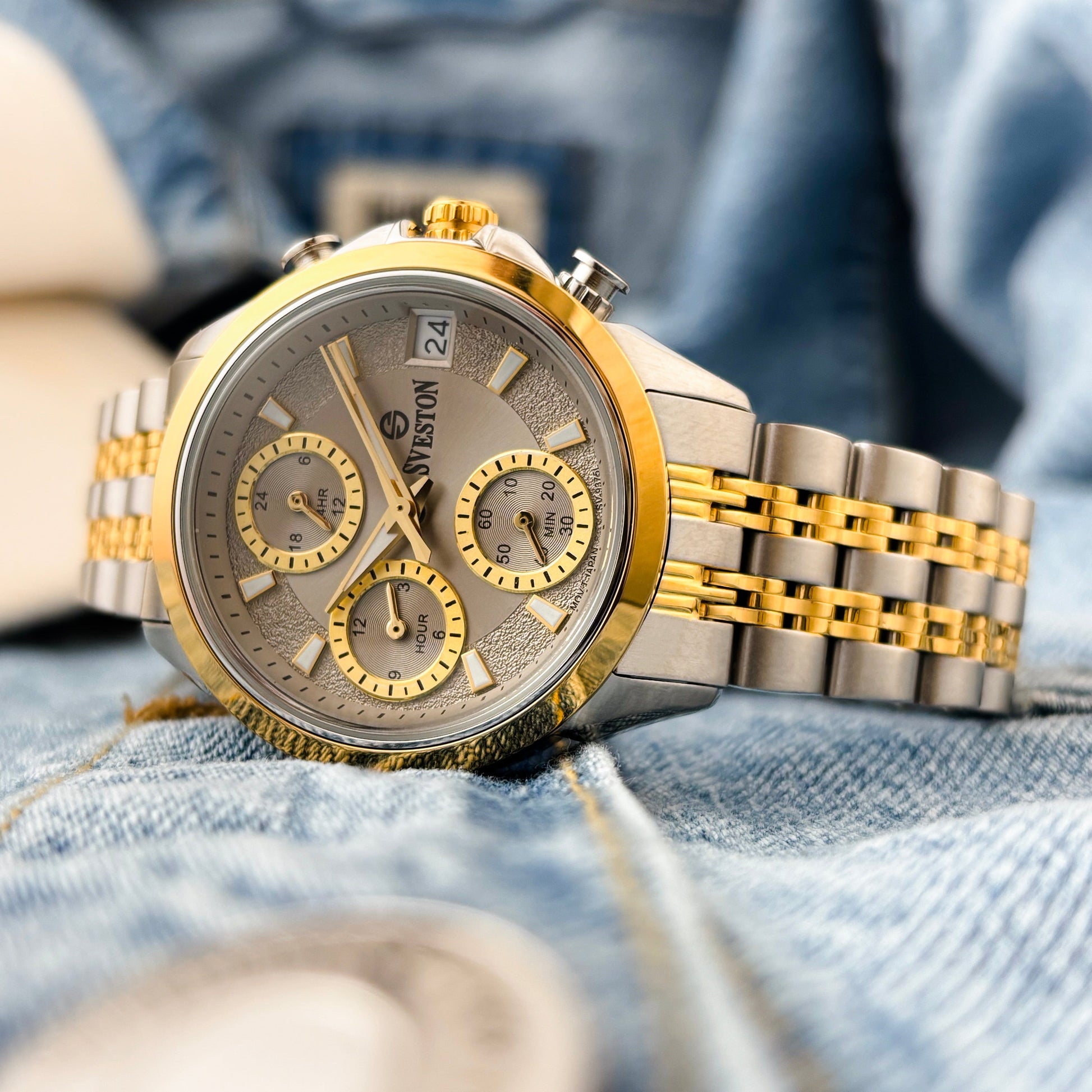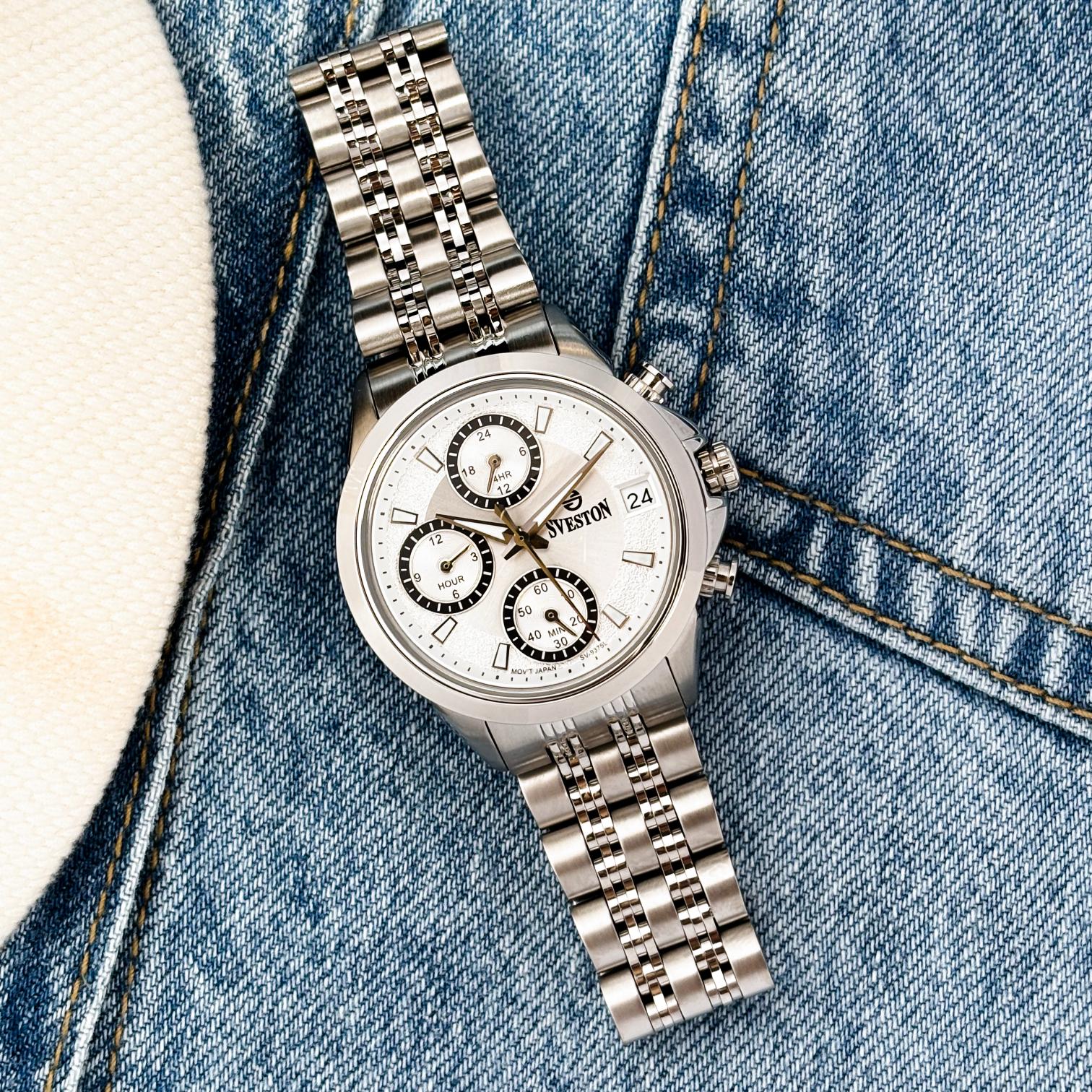 Sveston Elara is an analog, battery-powered chronograph 3-hand wristwatch, featuring a 31mm round case on a link stainless steel with a fold-over deployment clasp. Functions include hours, minutes, and small seconds. This watch comes complete with a luxury box and a 1-year international warranty.