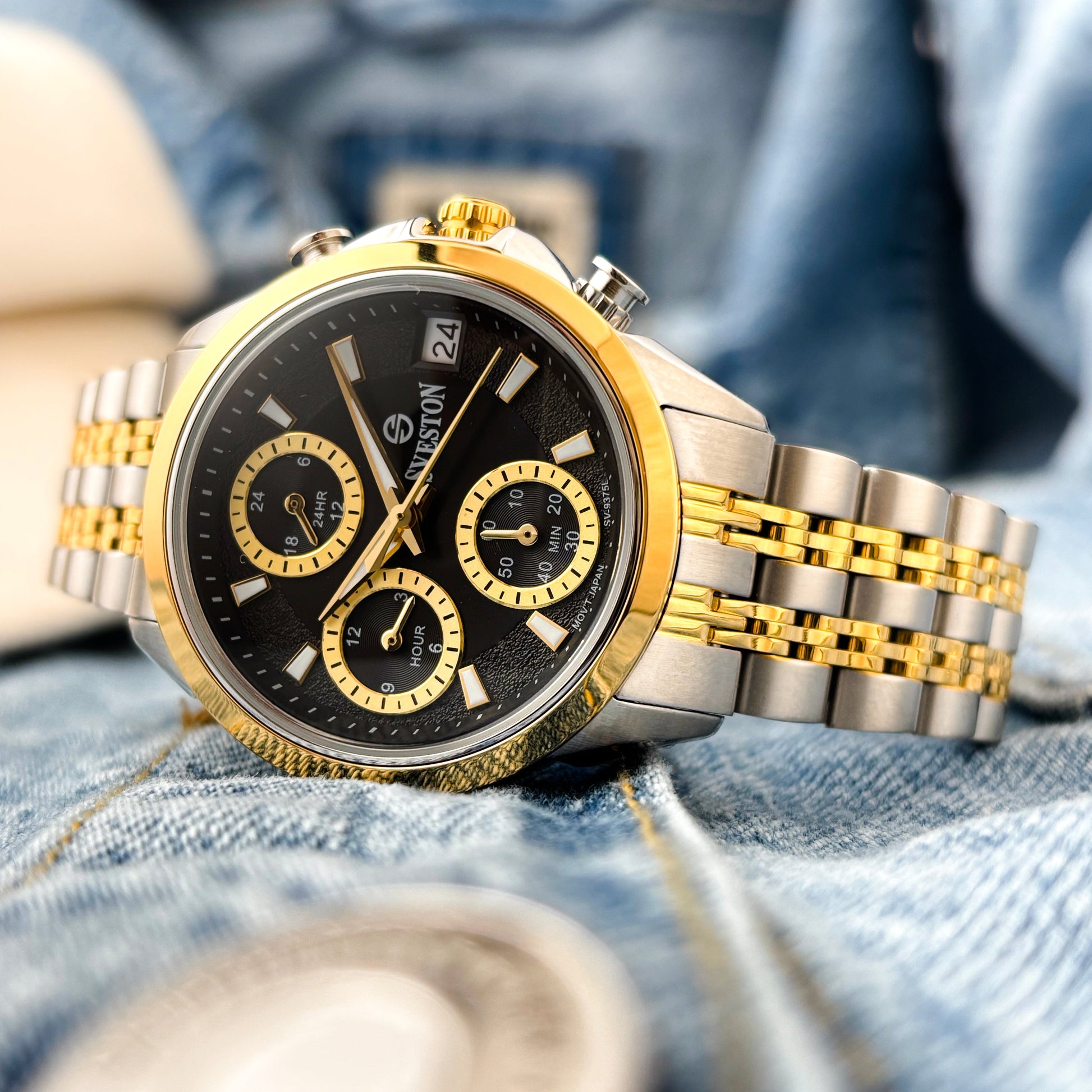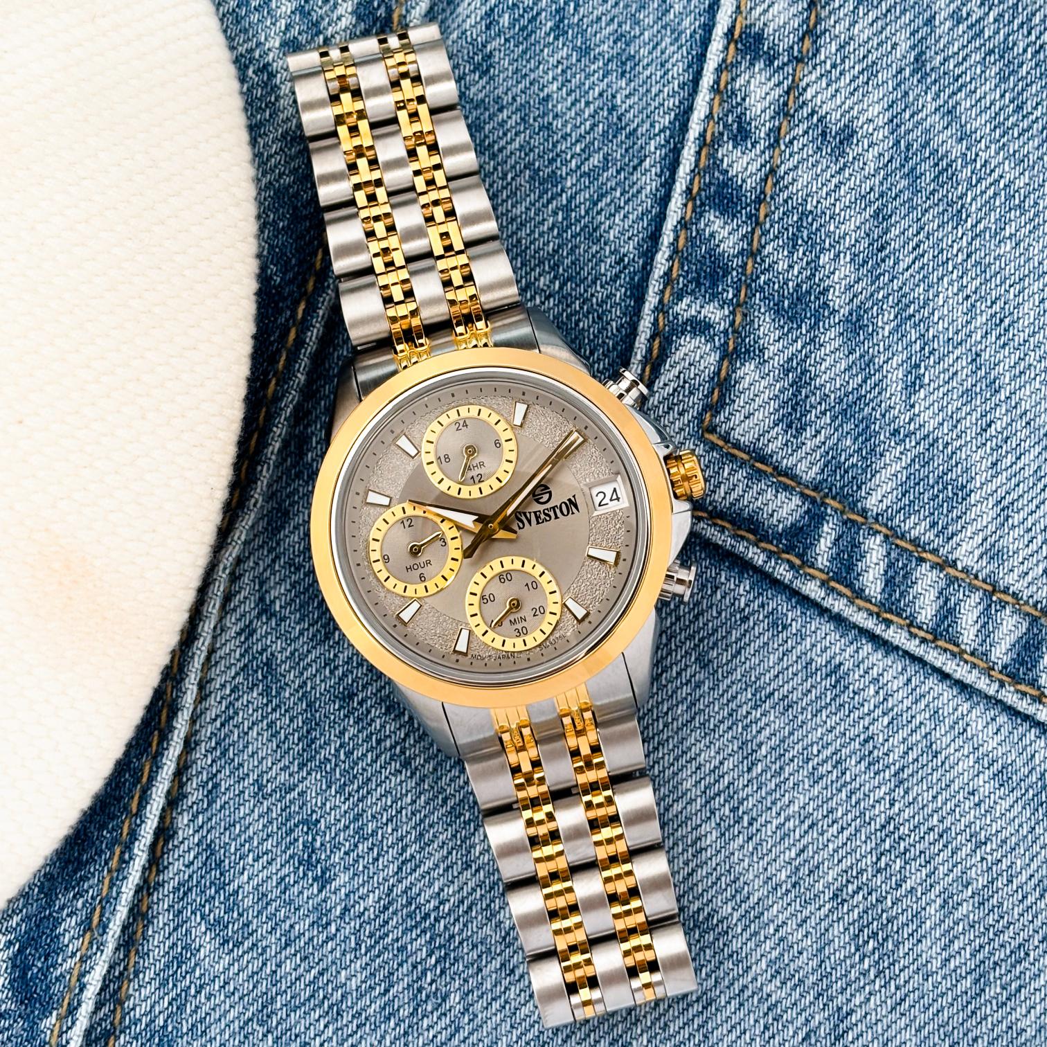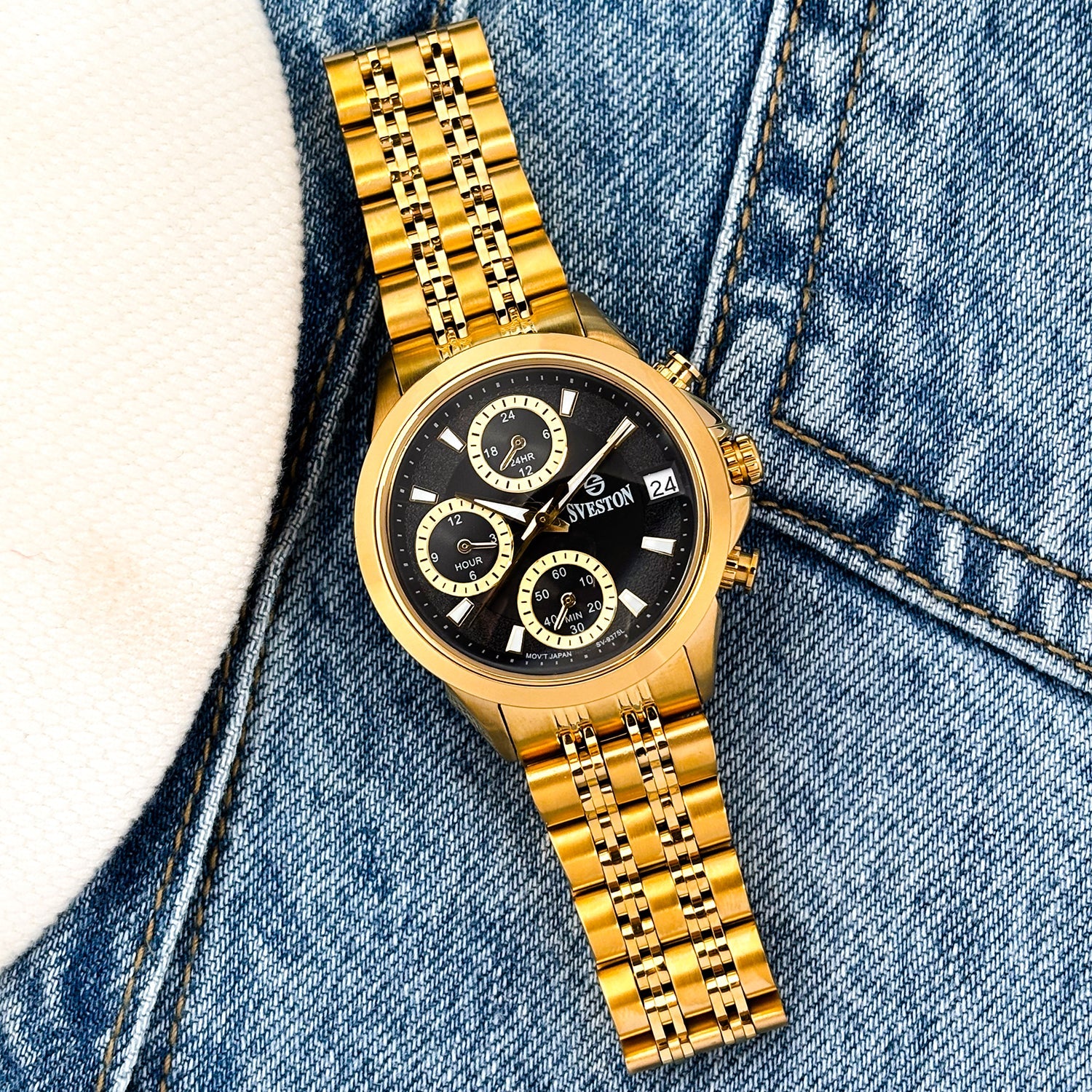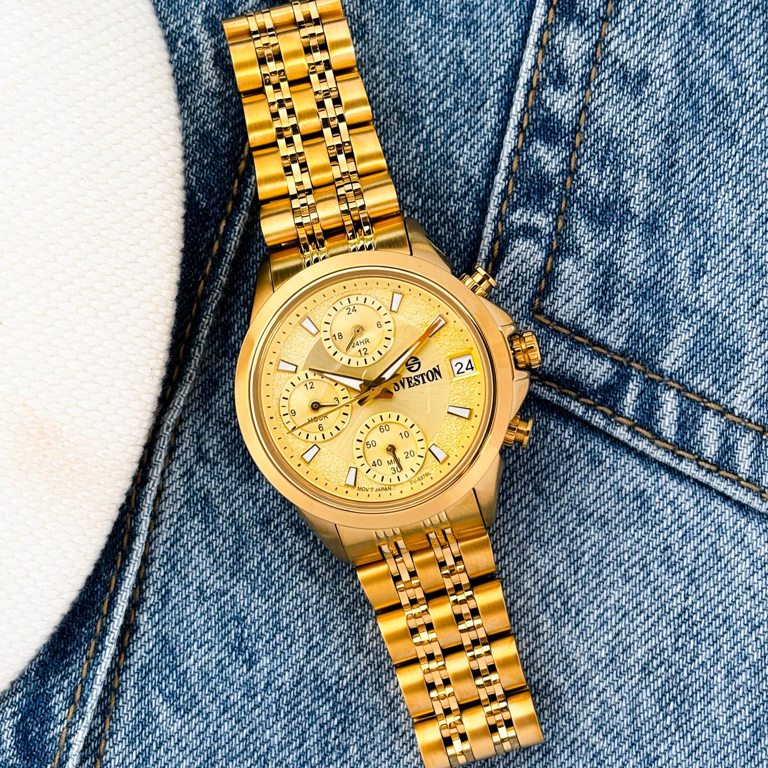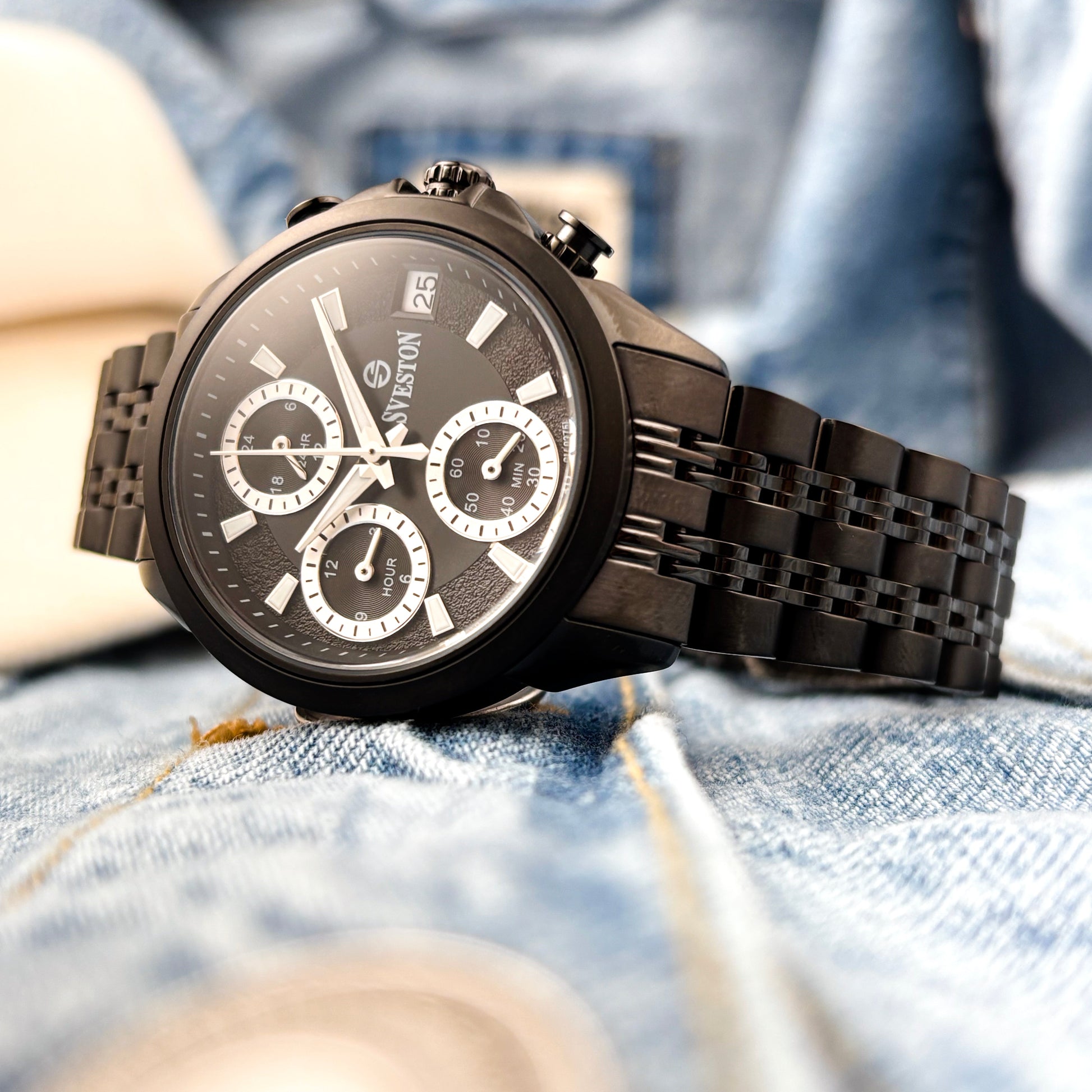 Sveston Elara is an analog, battery-powered chronograph 3-hand wristwatch, featuring a 31mm round case on a link stainless steel with a fold-over deployment clasp. Functions include hours, minutes, and small seconds. This watch comes complete with a luxury box and a 1-year international warranty.