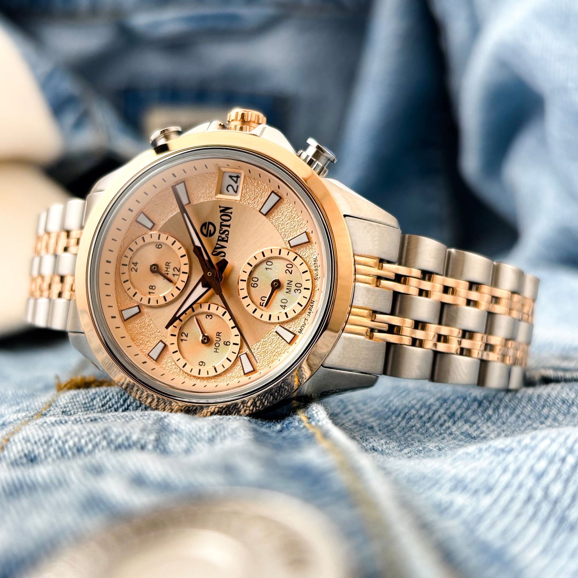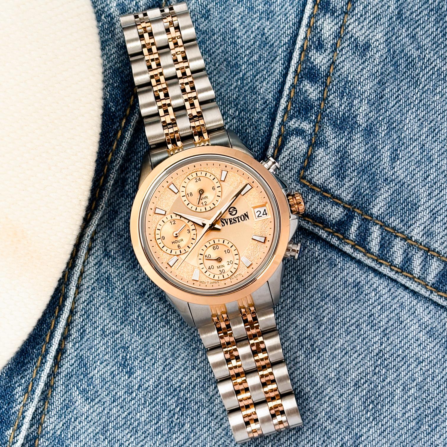 Sveston Elara is a feminine stainless steel chronograph watch featuring a 31mm dial and comes with a luxury watch case