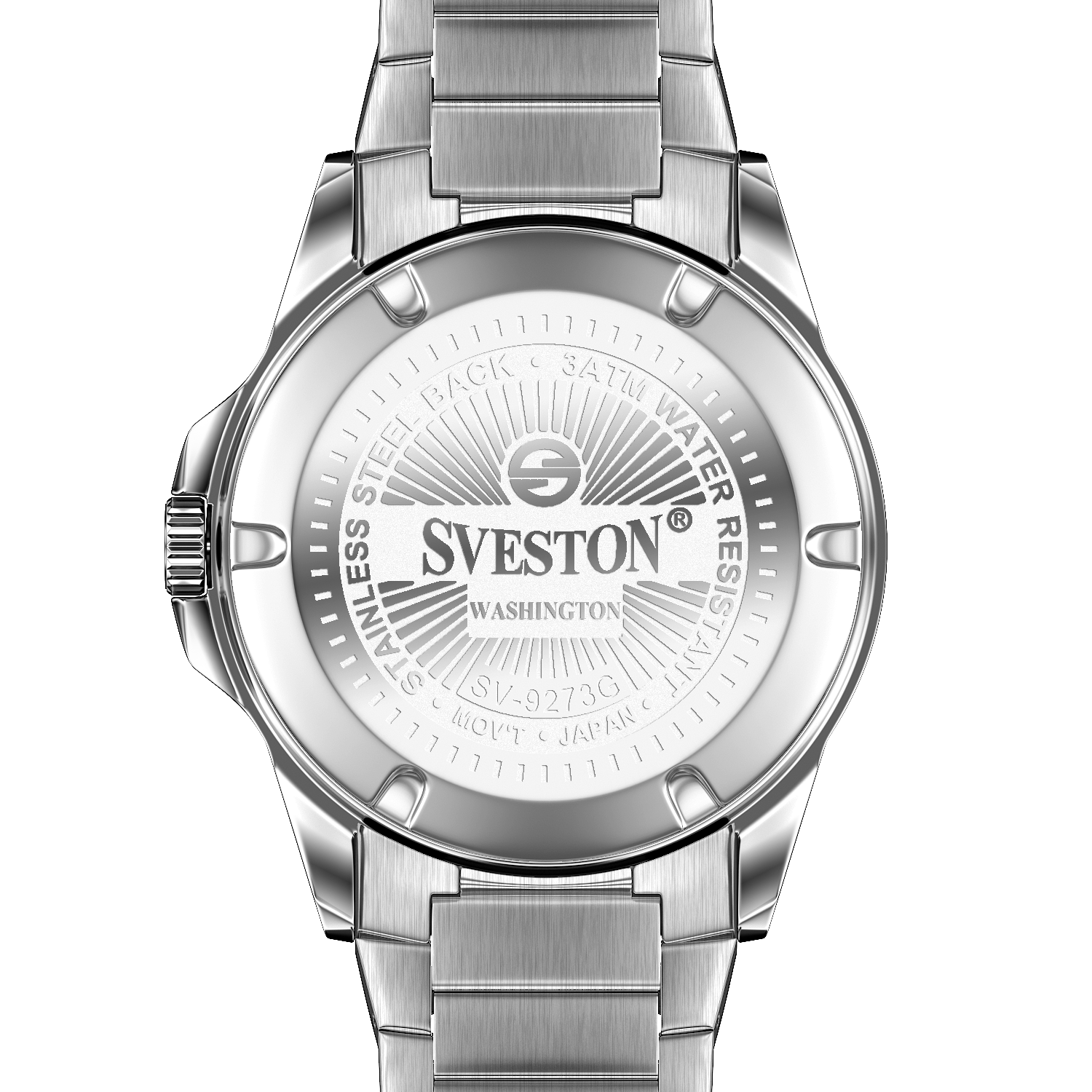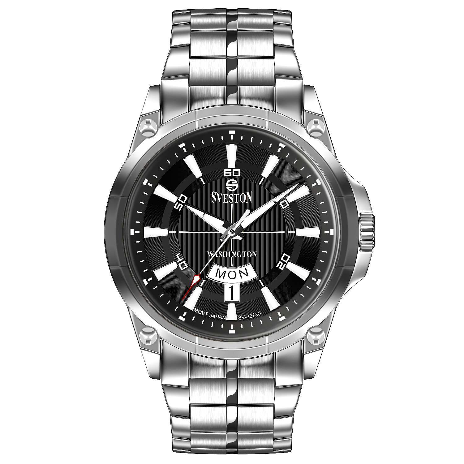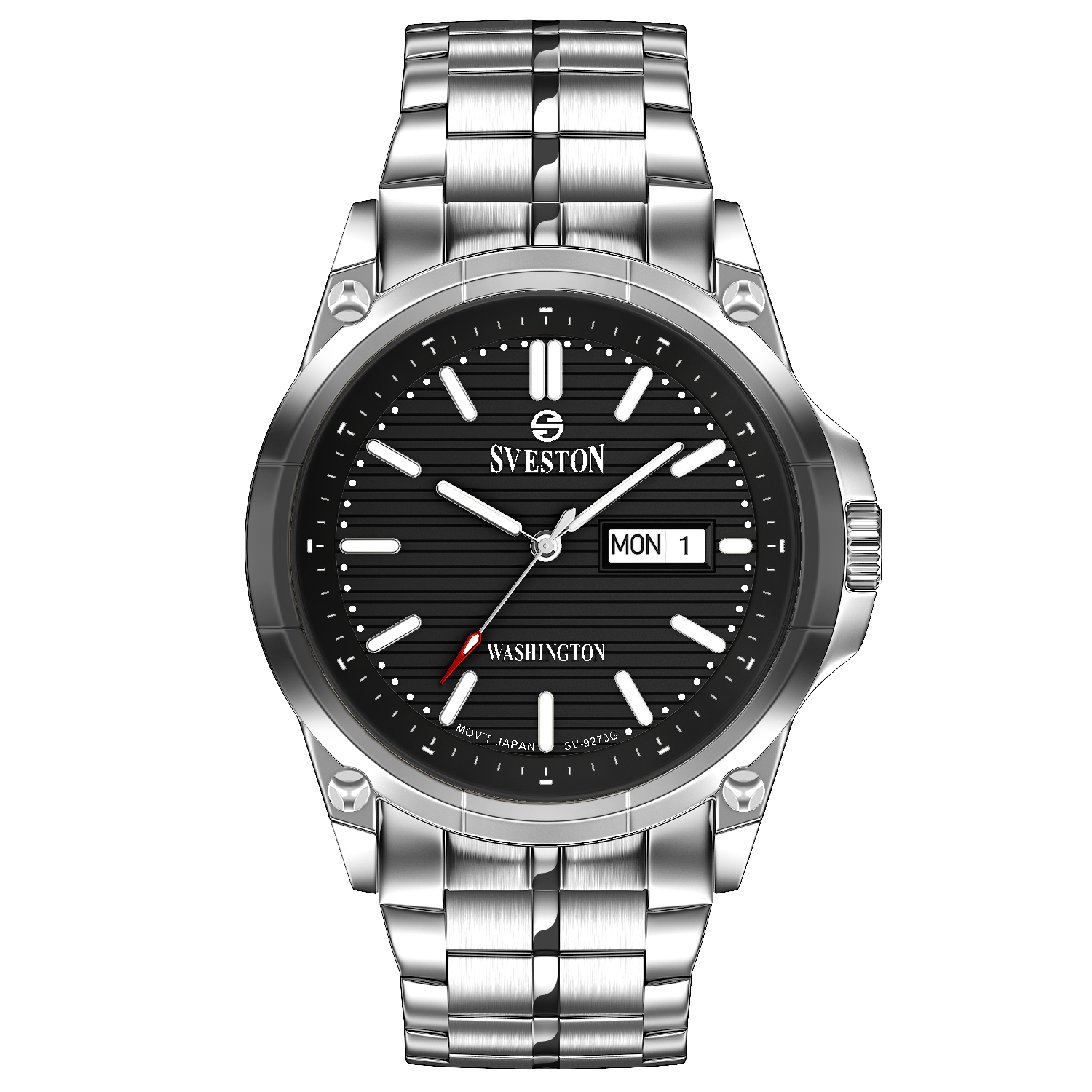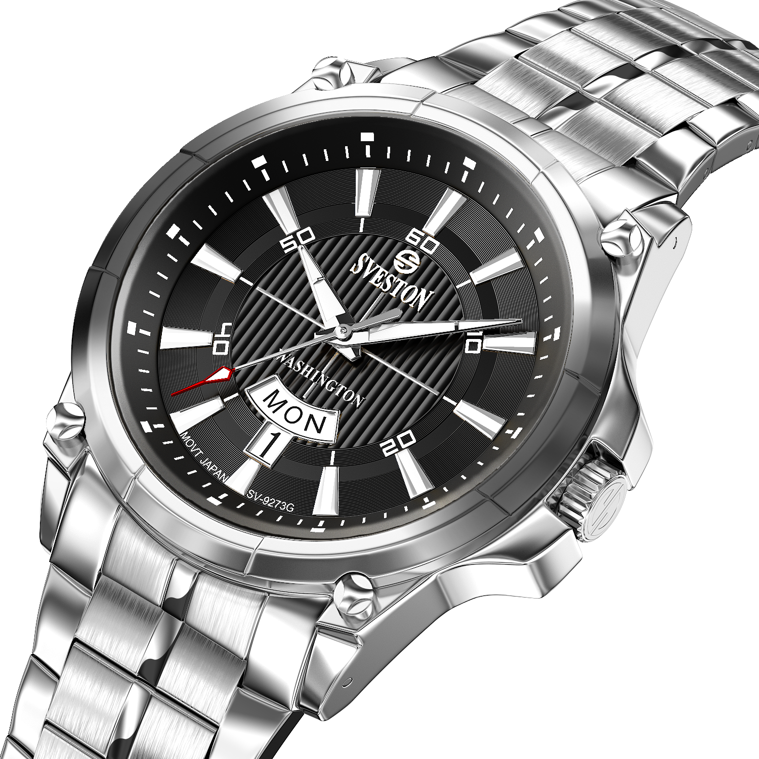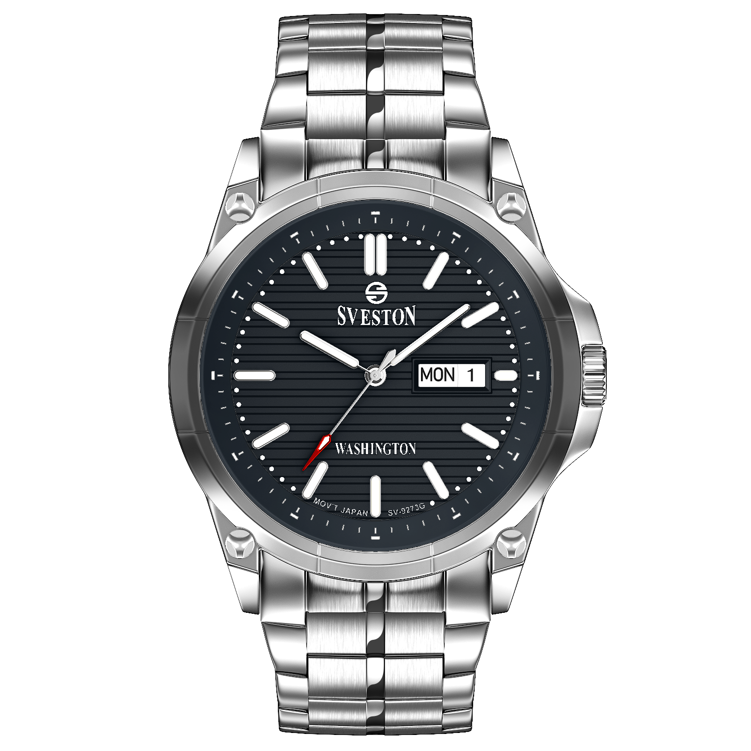 Sveston Stylish Washington analog battery powered 3 hand wrist watch features a 40mm round case on a Link Stainless Steel with Pushbutton Deployment Clasp Functions include hours minutes small seconds and date window on the Bottom this watch comes complete with luxury box and 1 year international warranty