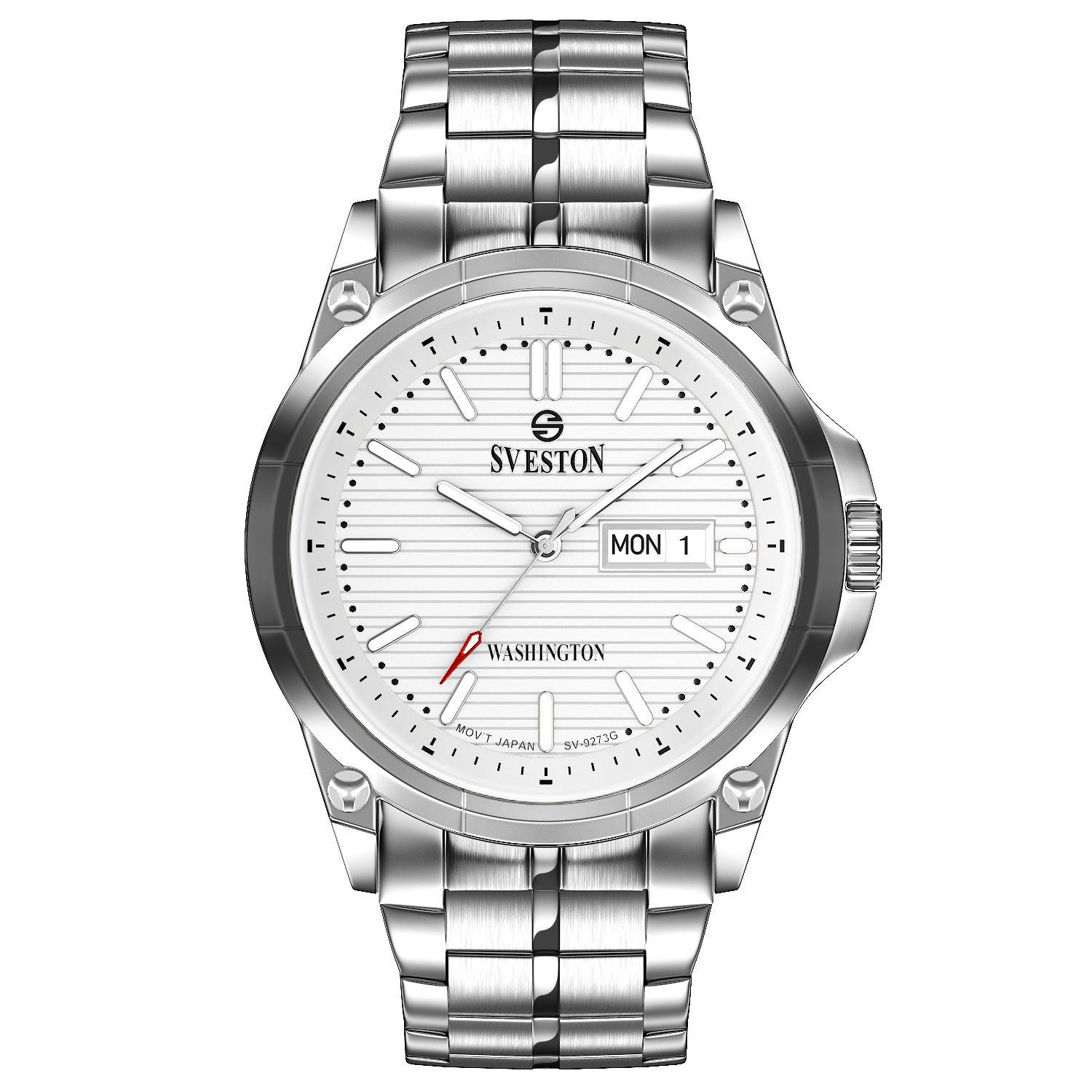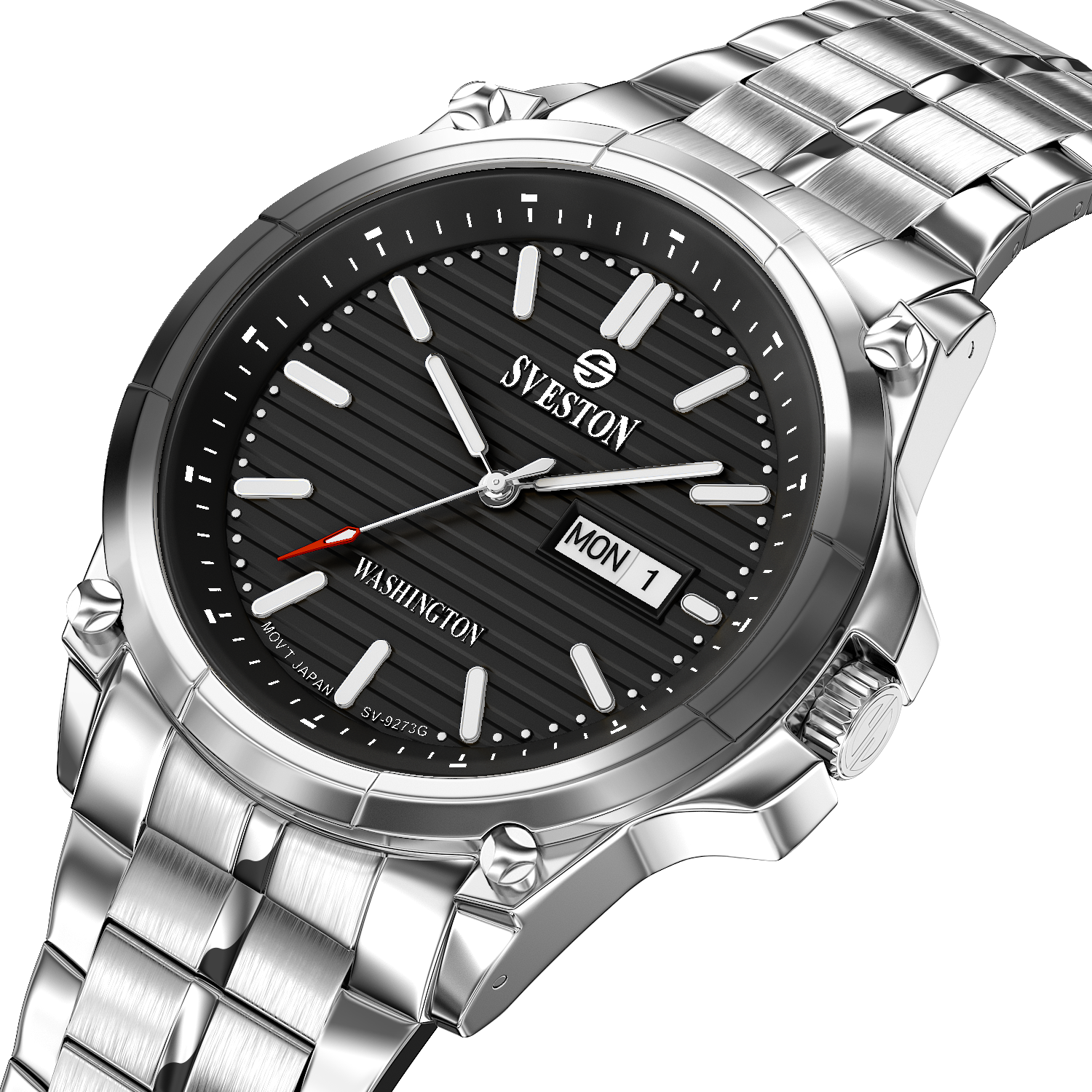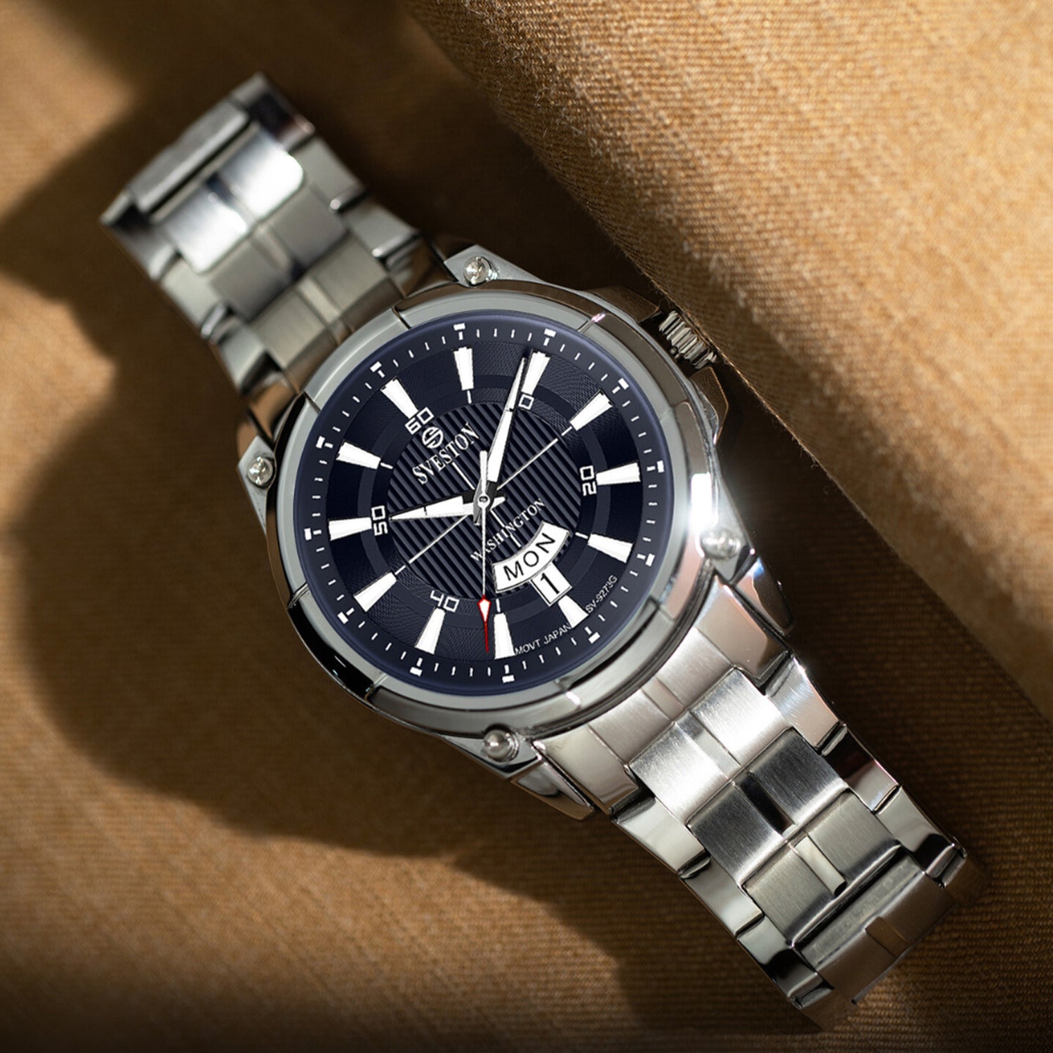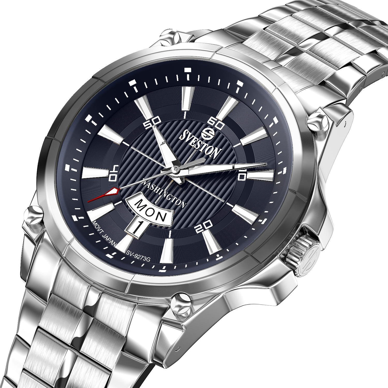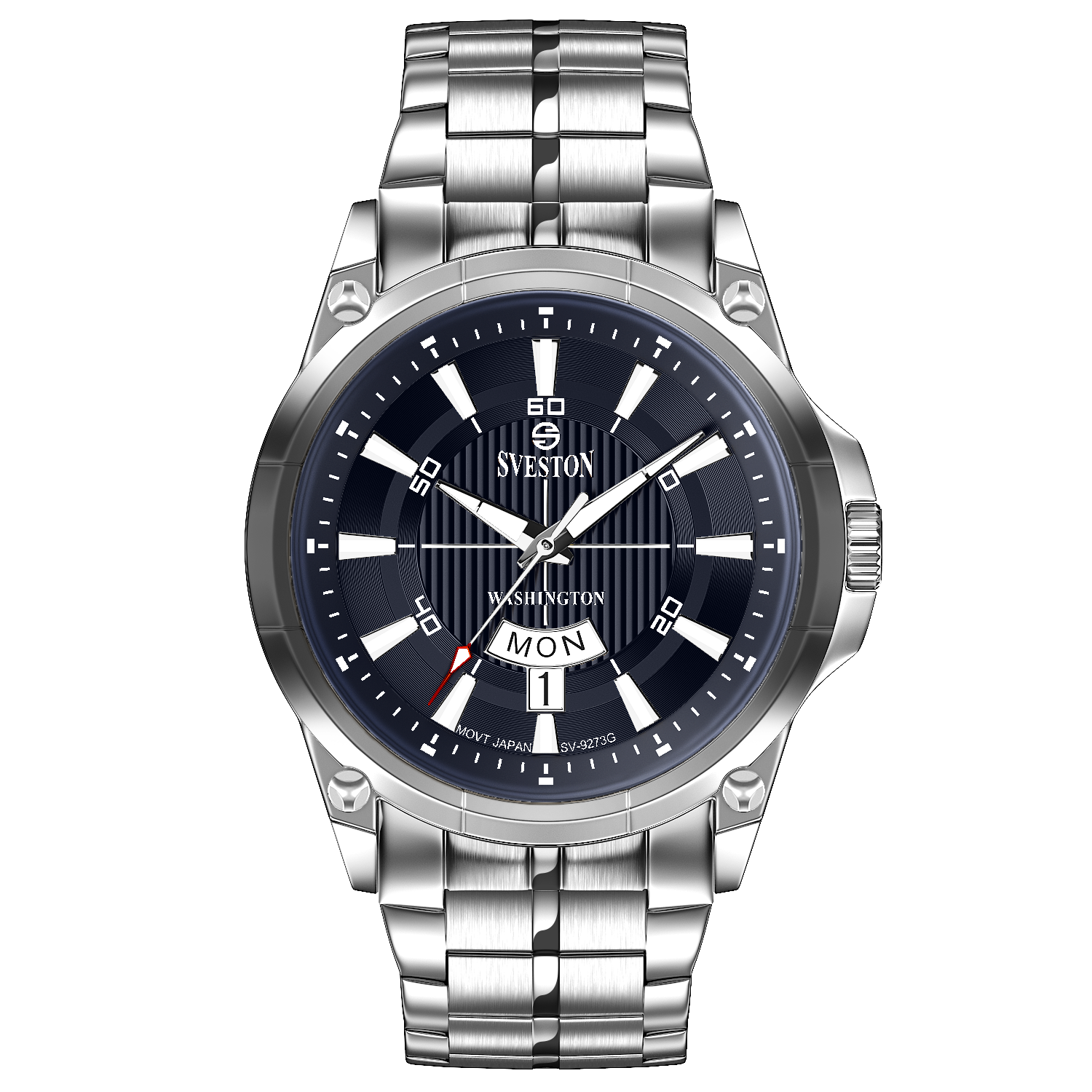 Sveston Stylish Washington analog battery powered 3 hand wrist watch features a 40mm round case on a Link Stainless Steel with Pushbutton Deployment Clasp Functions include hours minutes small seconds and date window on the Bottom this watch comes complete with luxury box and 1 year international warranty