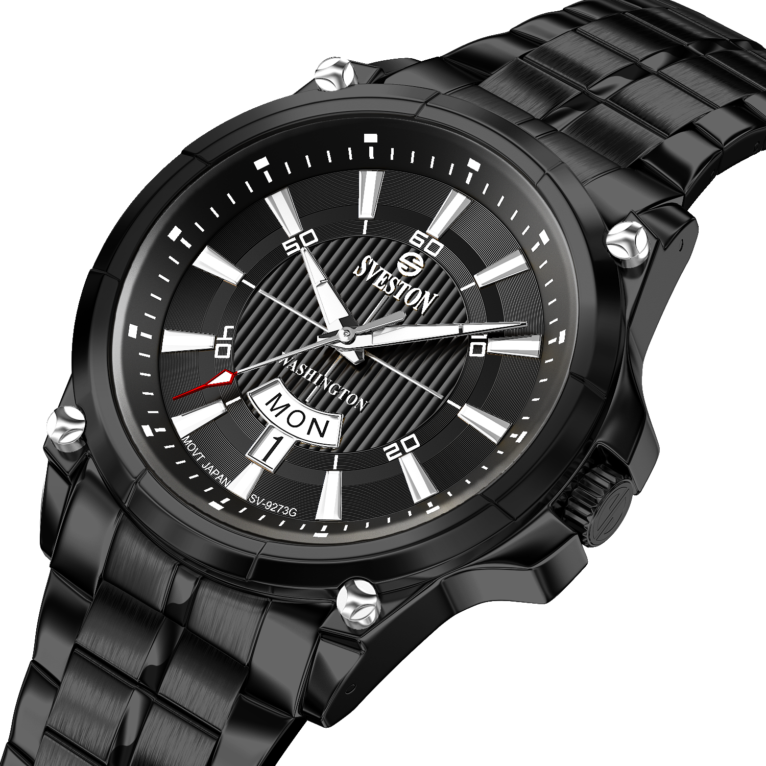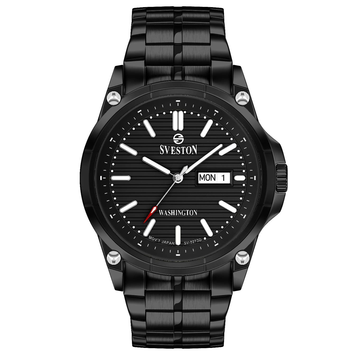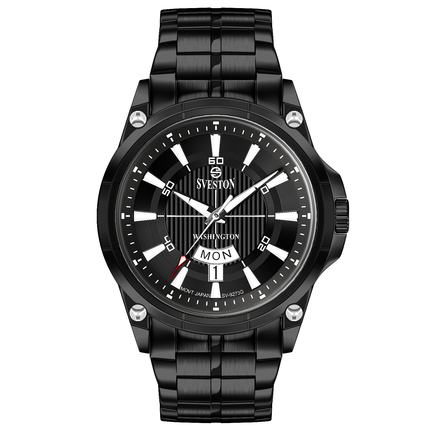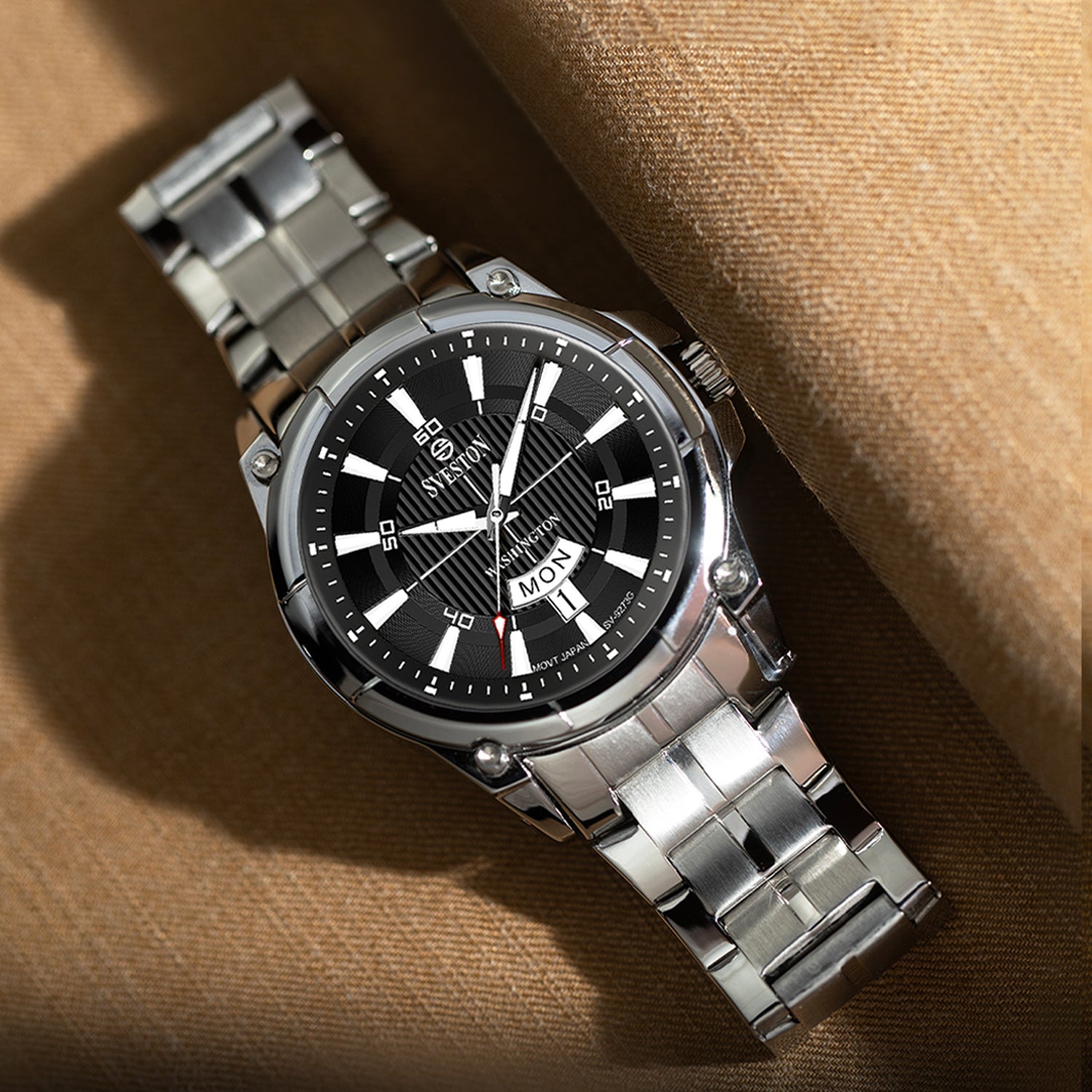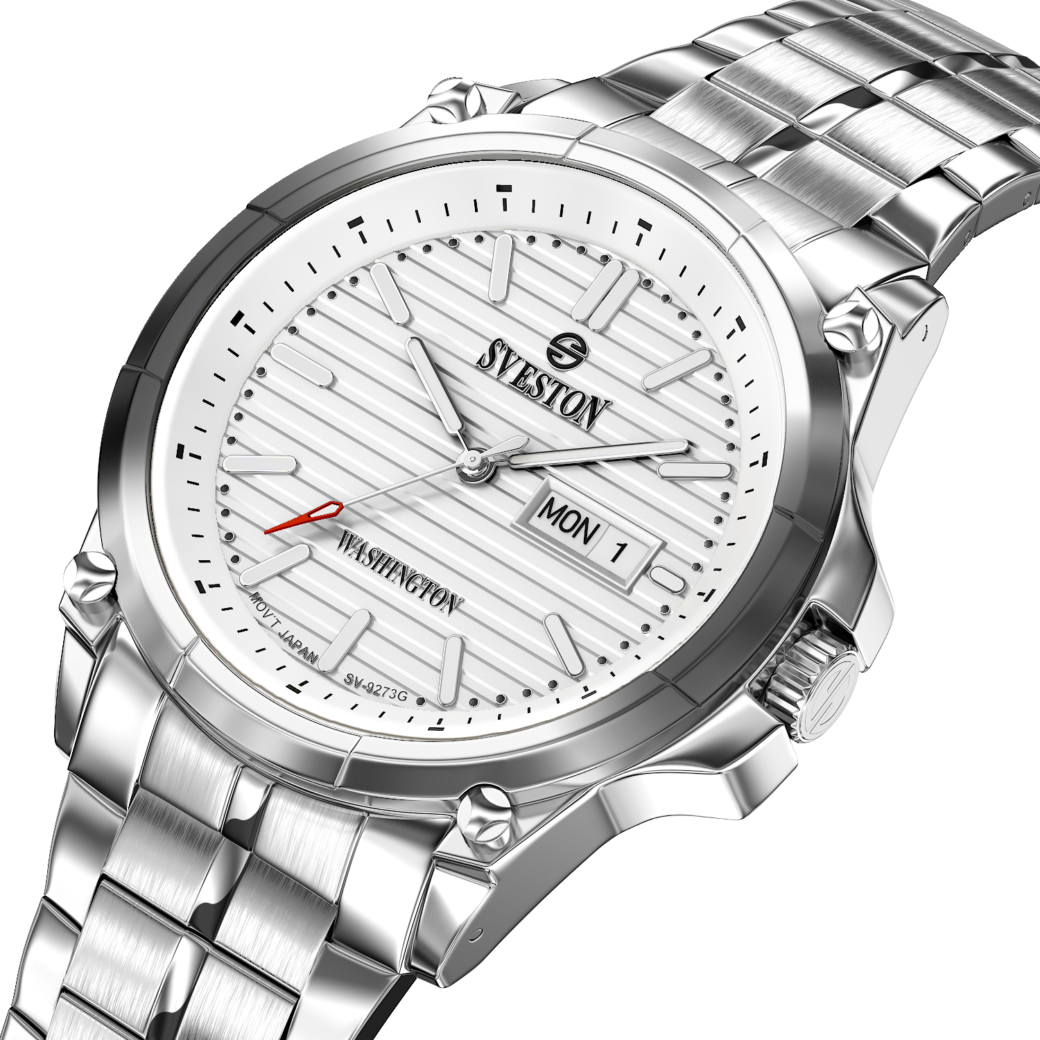 Sveston Stylish Washington analog battery powered 3 hand wrist watch features a 40mm round case on a Link Stainless Steel with Pushbutton Deployment Clasp Functions include hours minutes small seconds and date window on the Bottom this watch comes complete with luxury box and 1 year international warranty