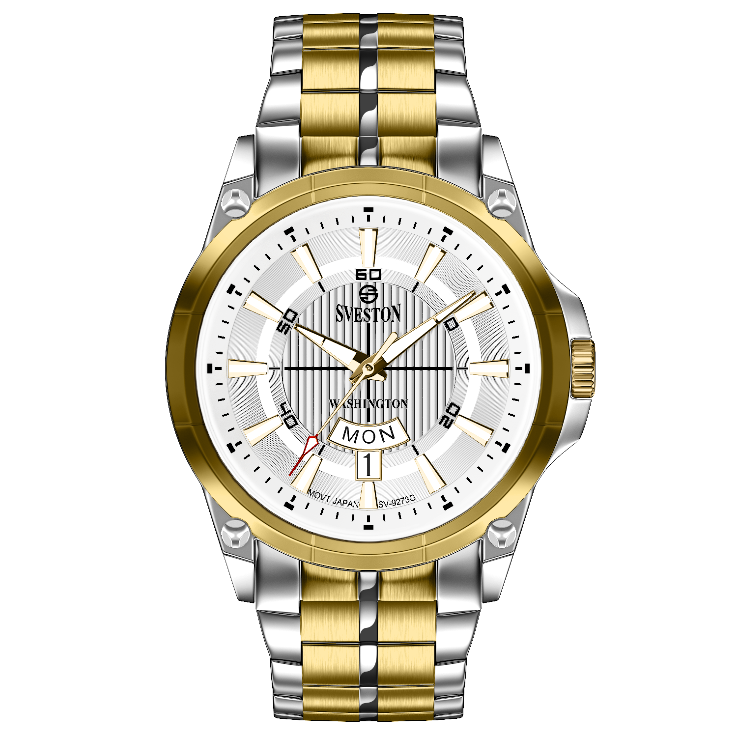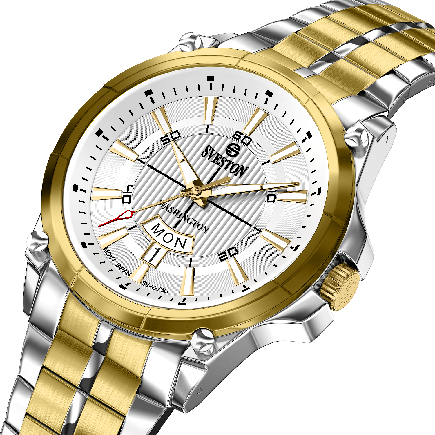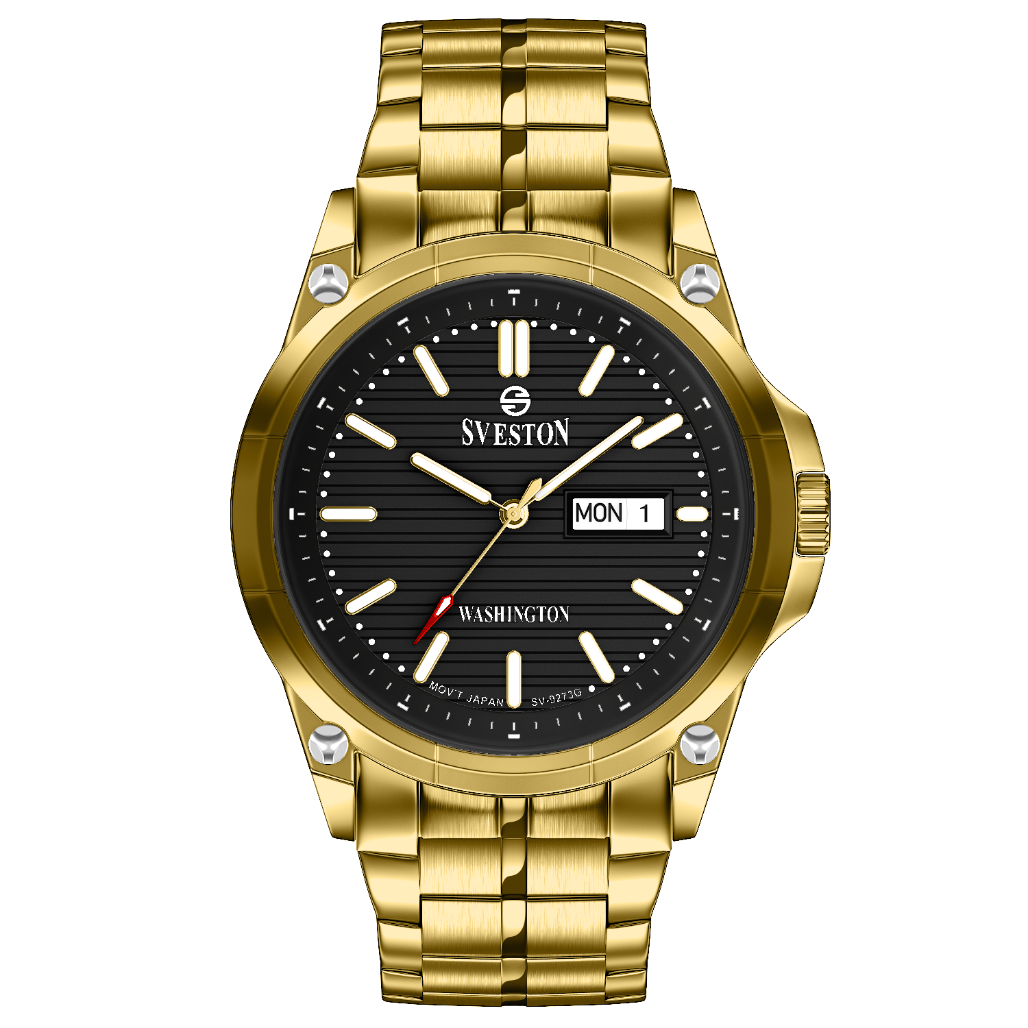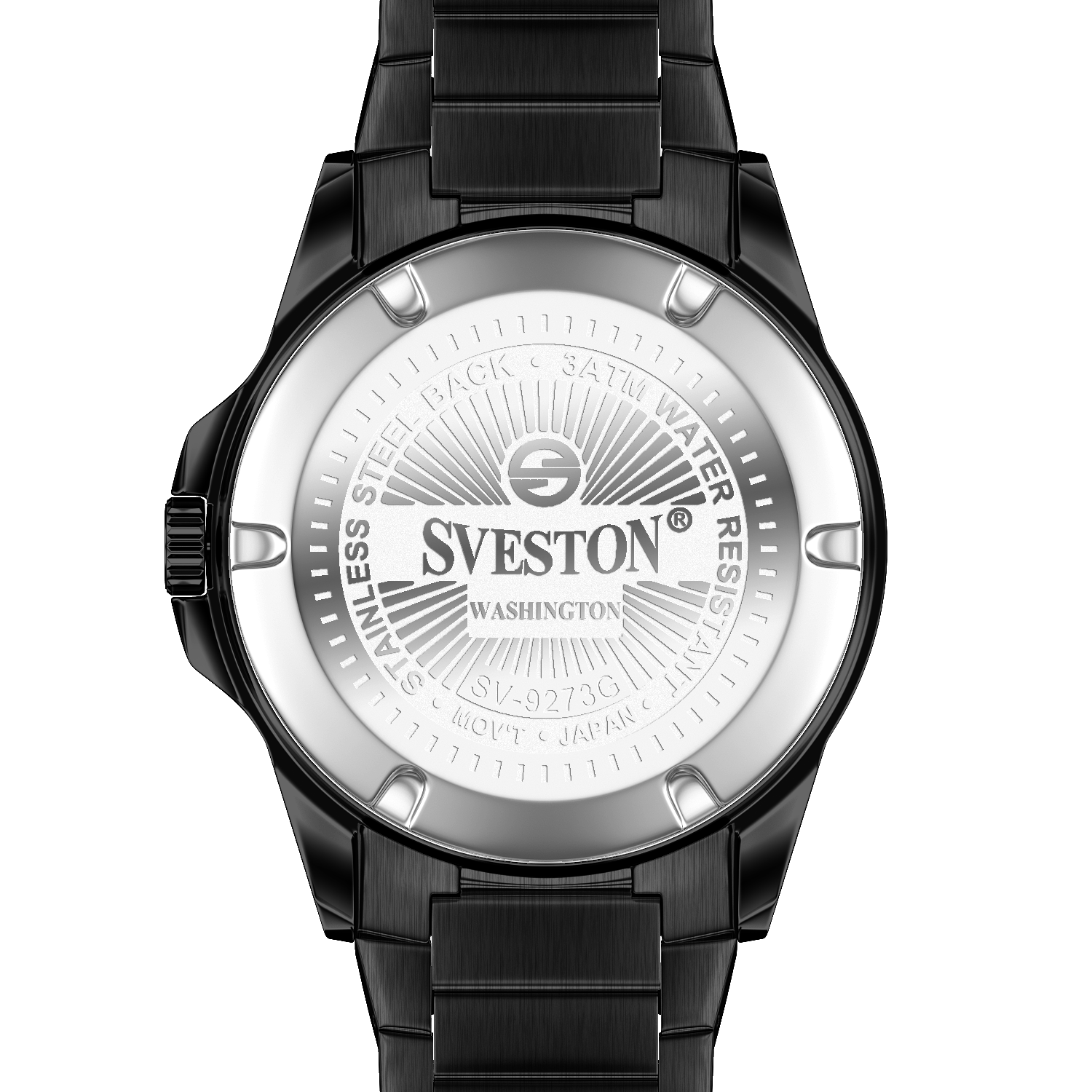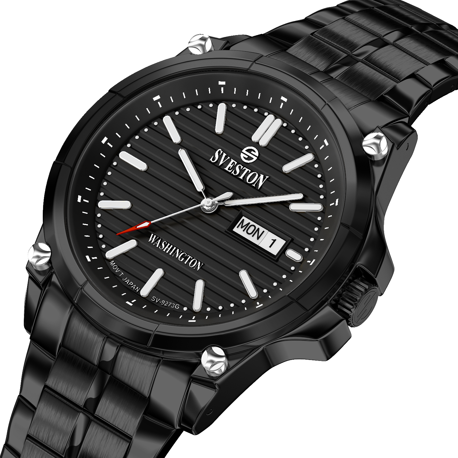 Sveston Stylish Washington analog battery powered 3 hand wrist watch features a 40mm round case on a Link Stainless Steel with Pushbutton Deployment Clasp Functions include hours minutes small seconds and date window on the Bottom this watch comes complete with luxury box and 1 year international warranty
