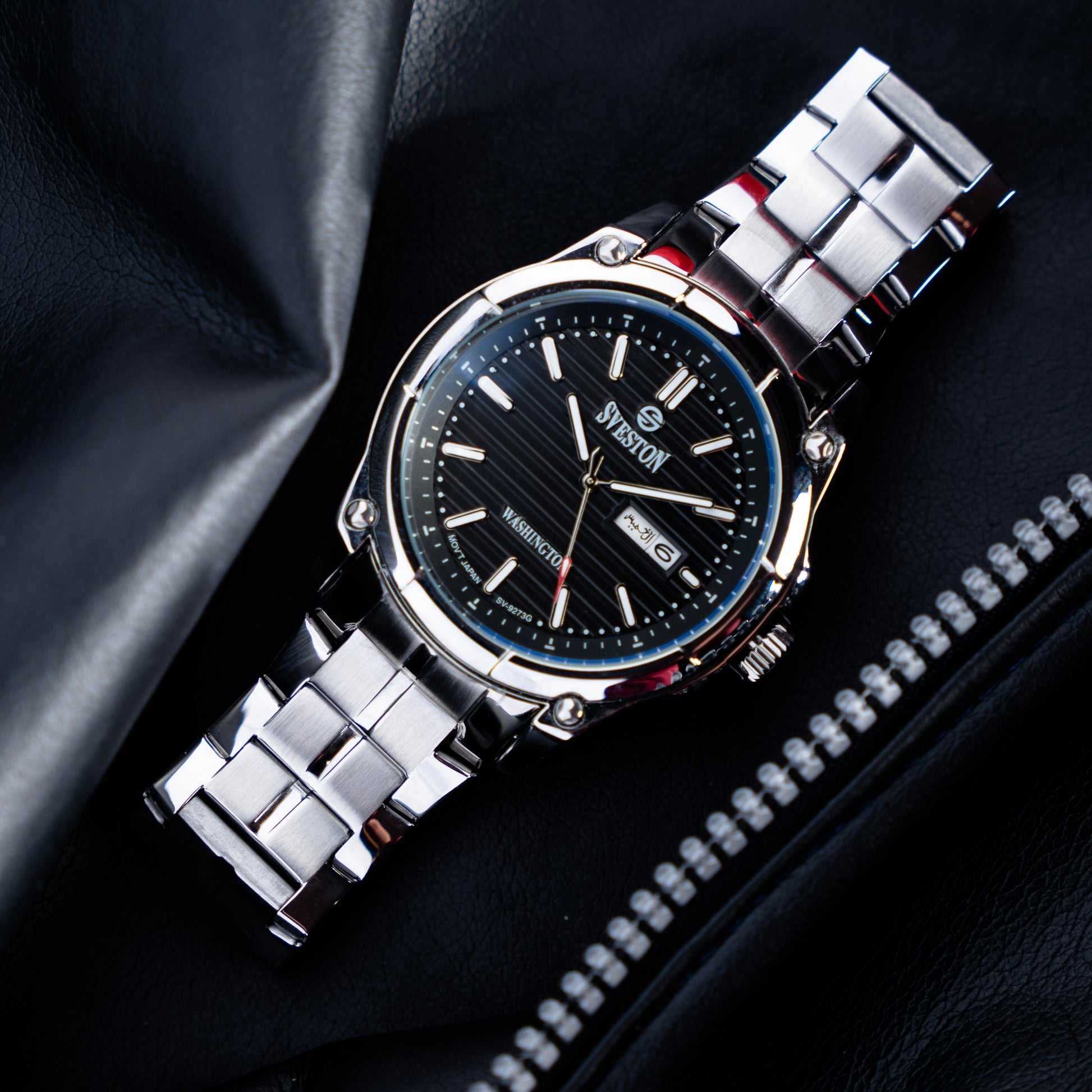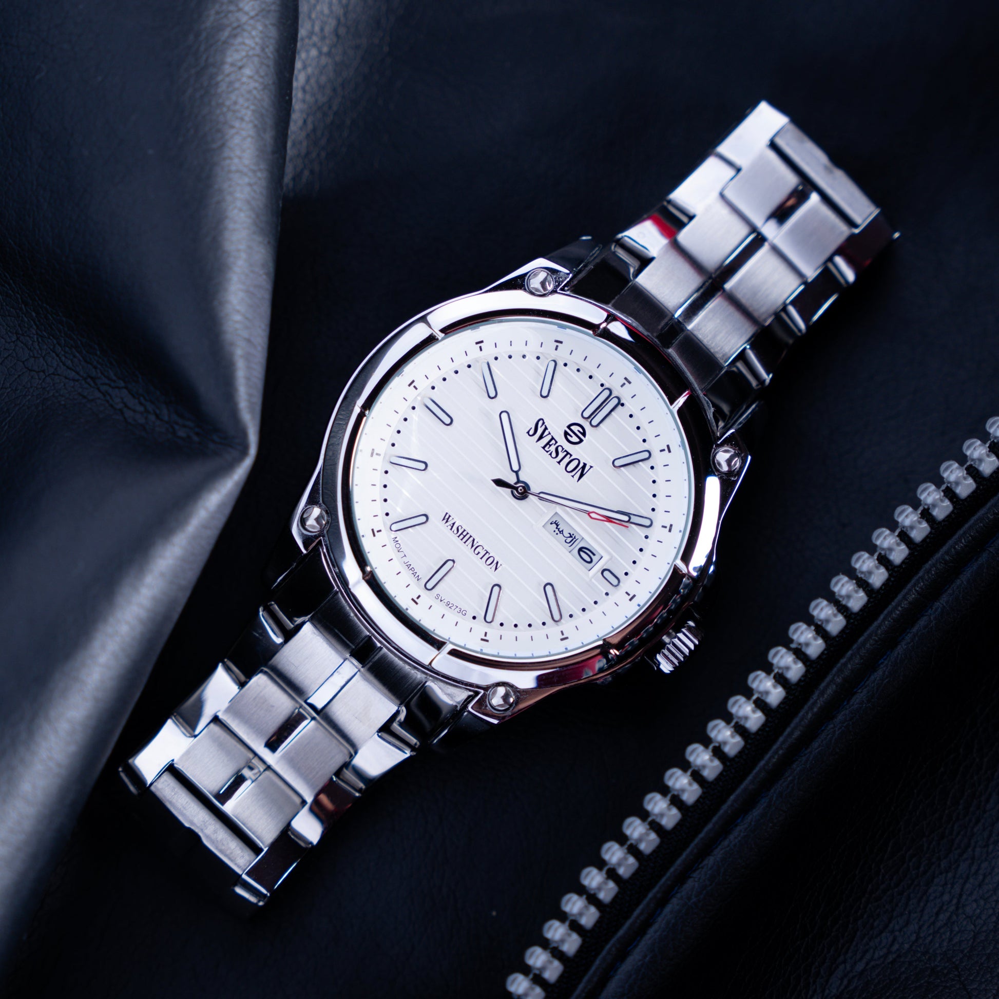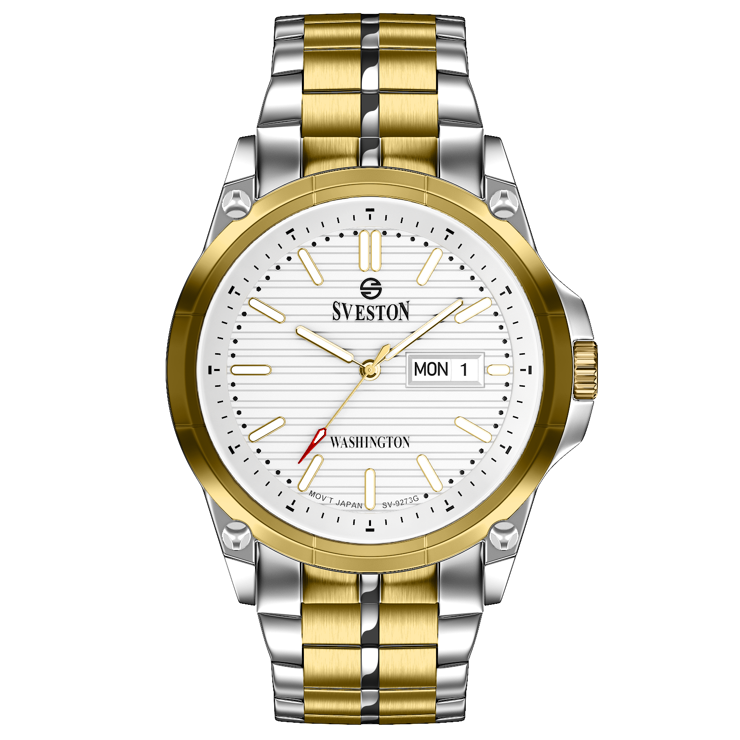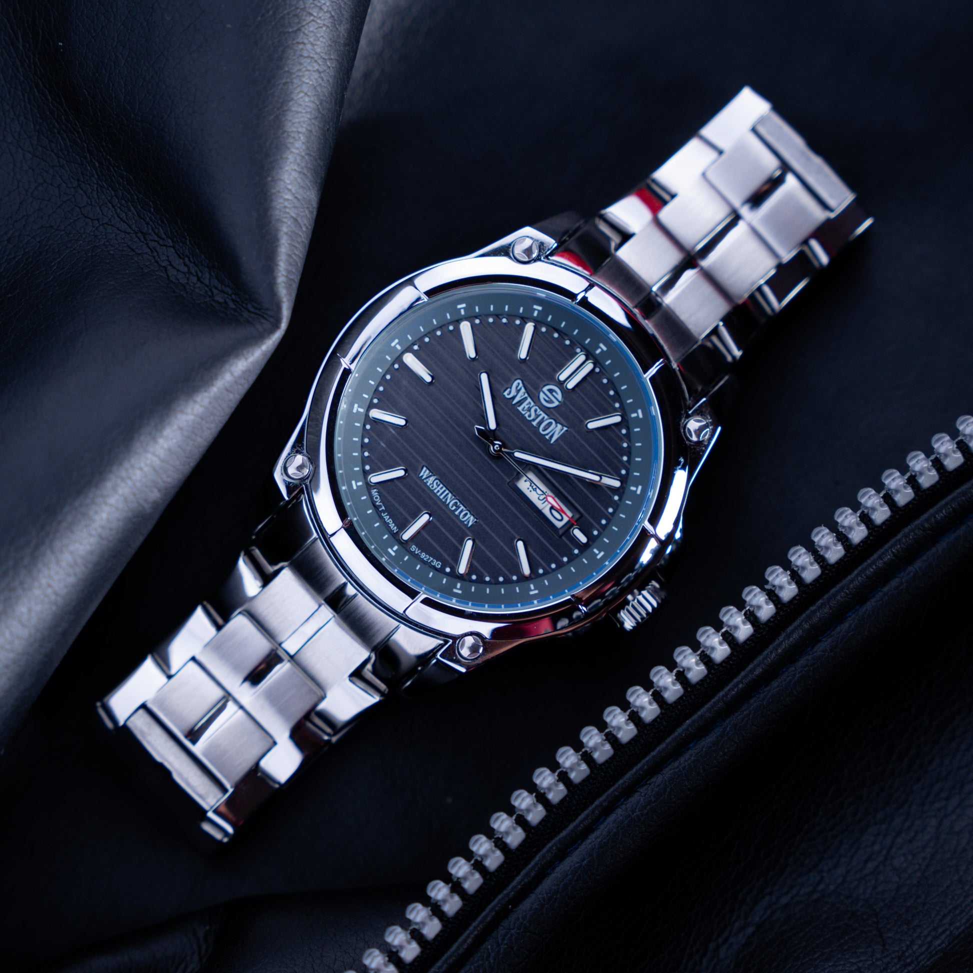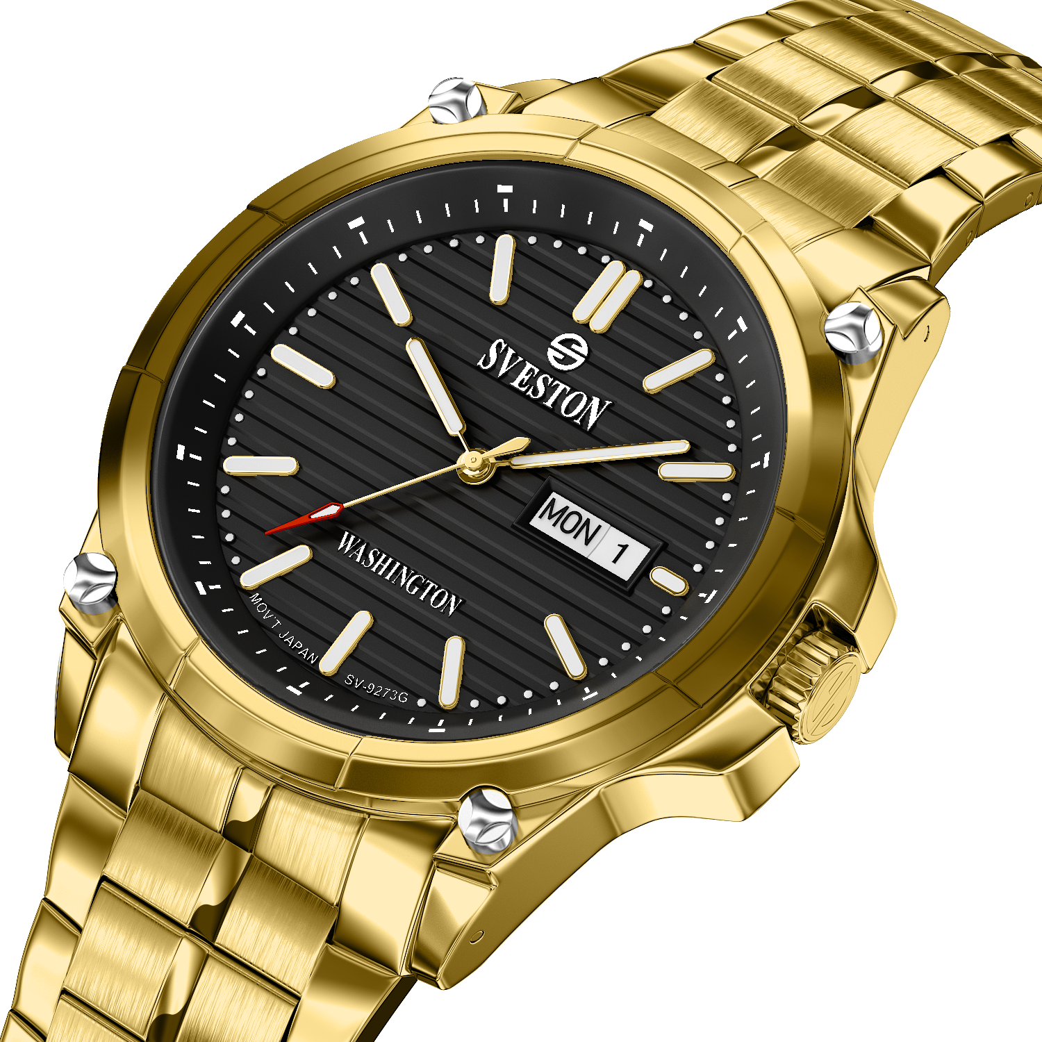 Sveston Stylish Washington analog battery powered 3 hand wrist watch features a 40mm round case on a Link Stainless Steel with Pushbutton Deployment Clasp Functions include hours minutes small seconds and date window on the Bottom this watch comes complete with luxury box and 1 year international warranty