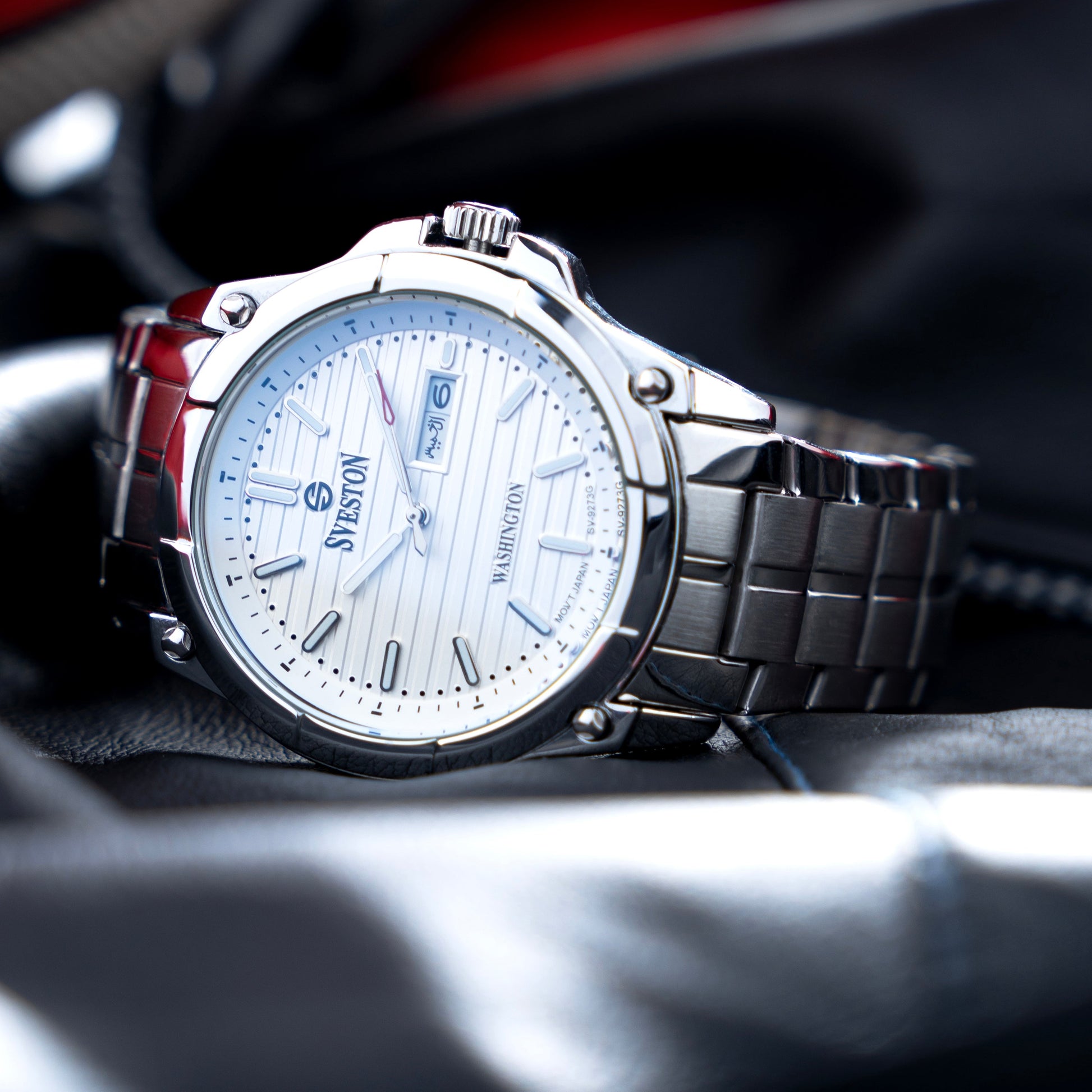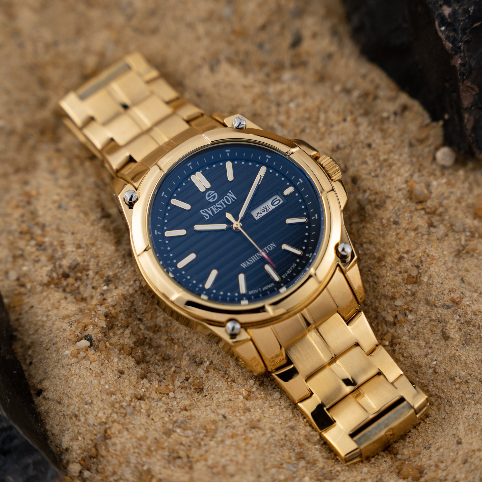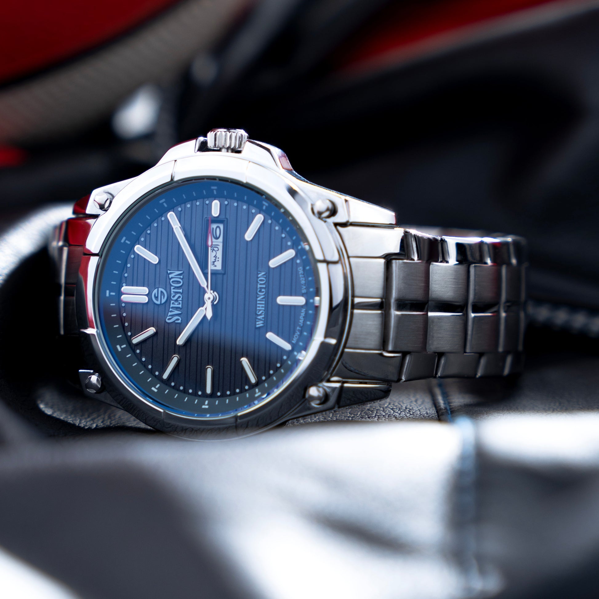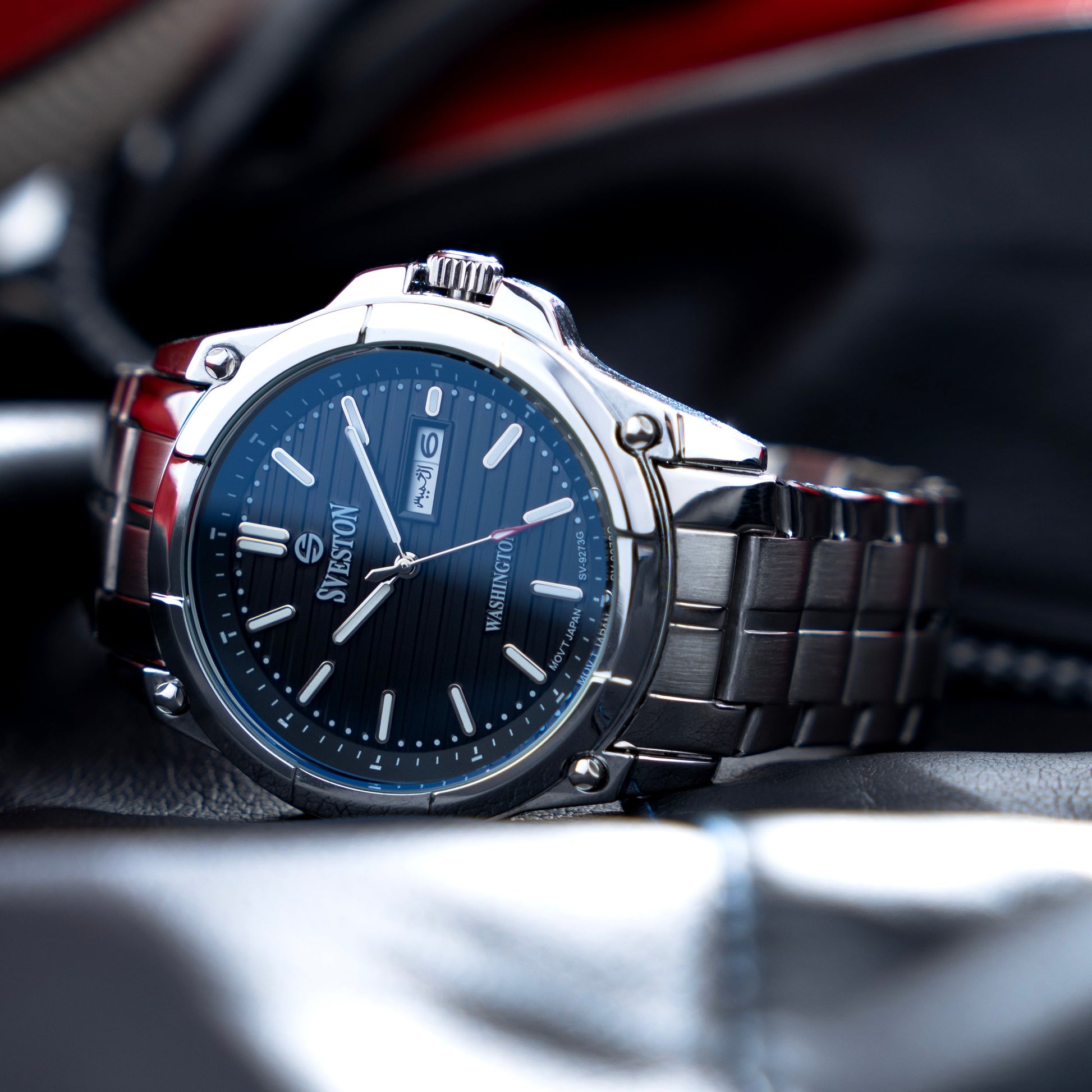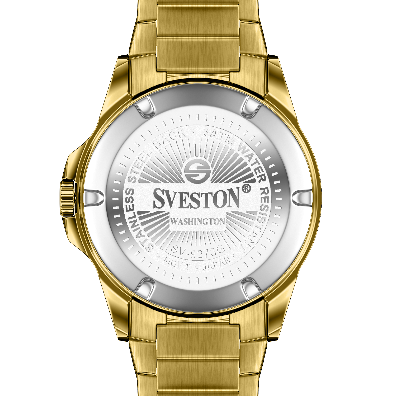 Sveston Stylish Washington analog battery powered 3 hand wrist watch features a 40mm round case on a Link Stainless Steel with Pushbutton Deployment Clasp Functions include hours minutes small seconds and date window on the Bottom this watch comes complete with luxury box and 1 year international warranty