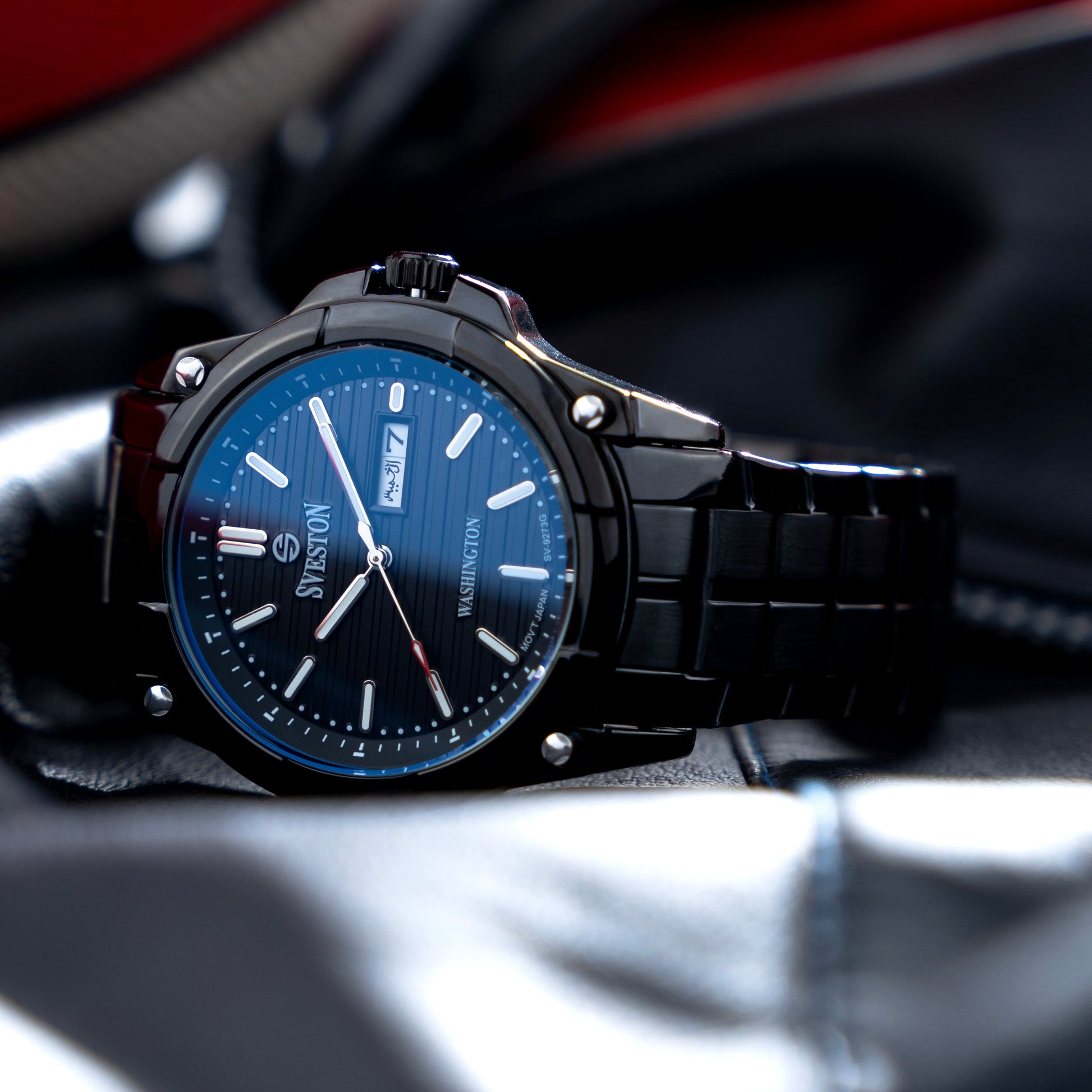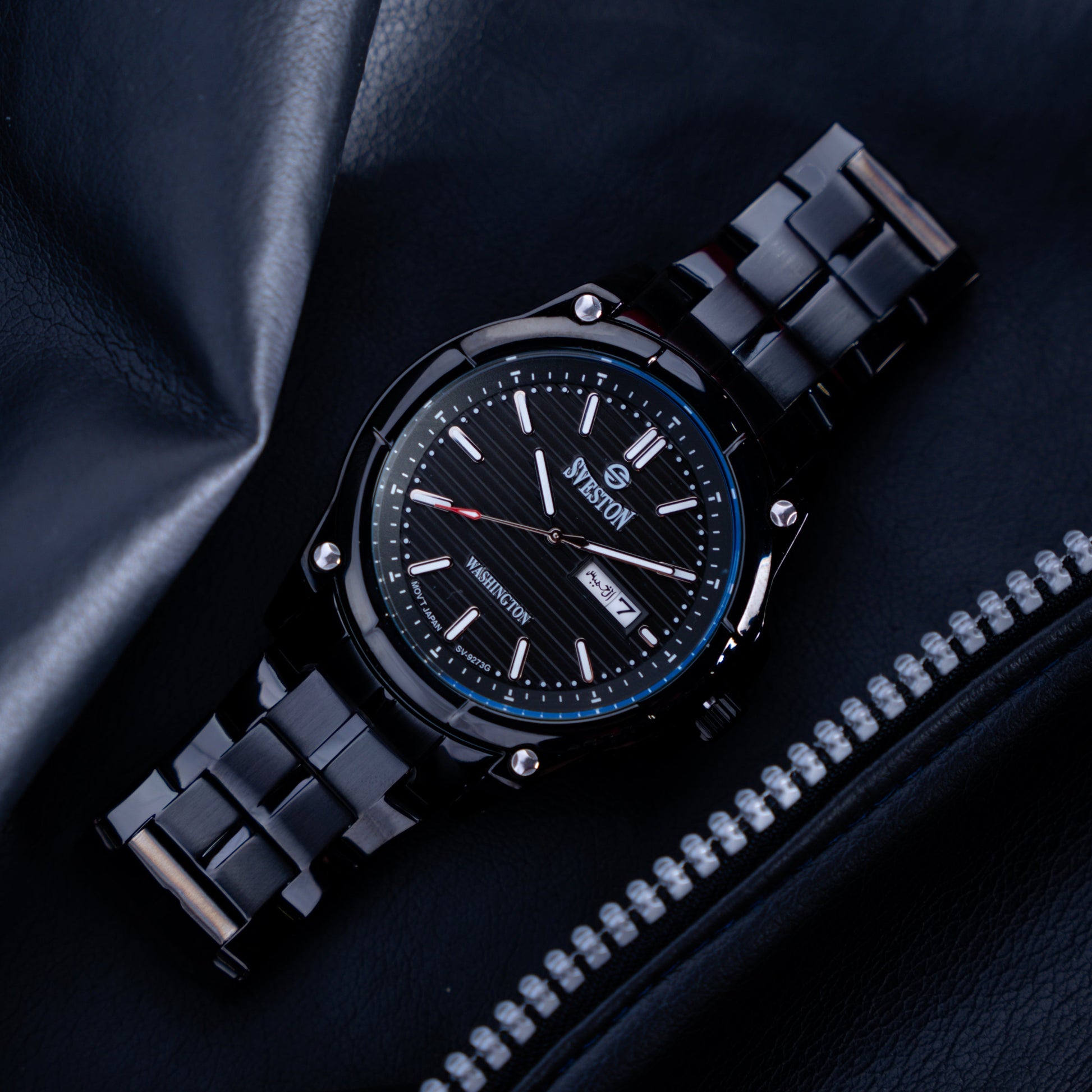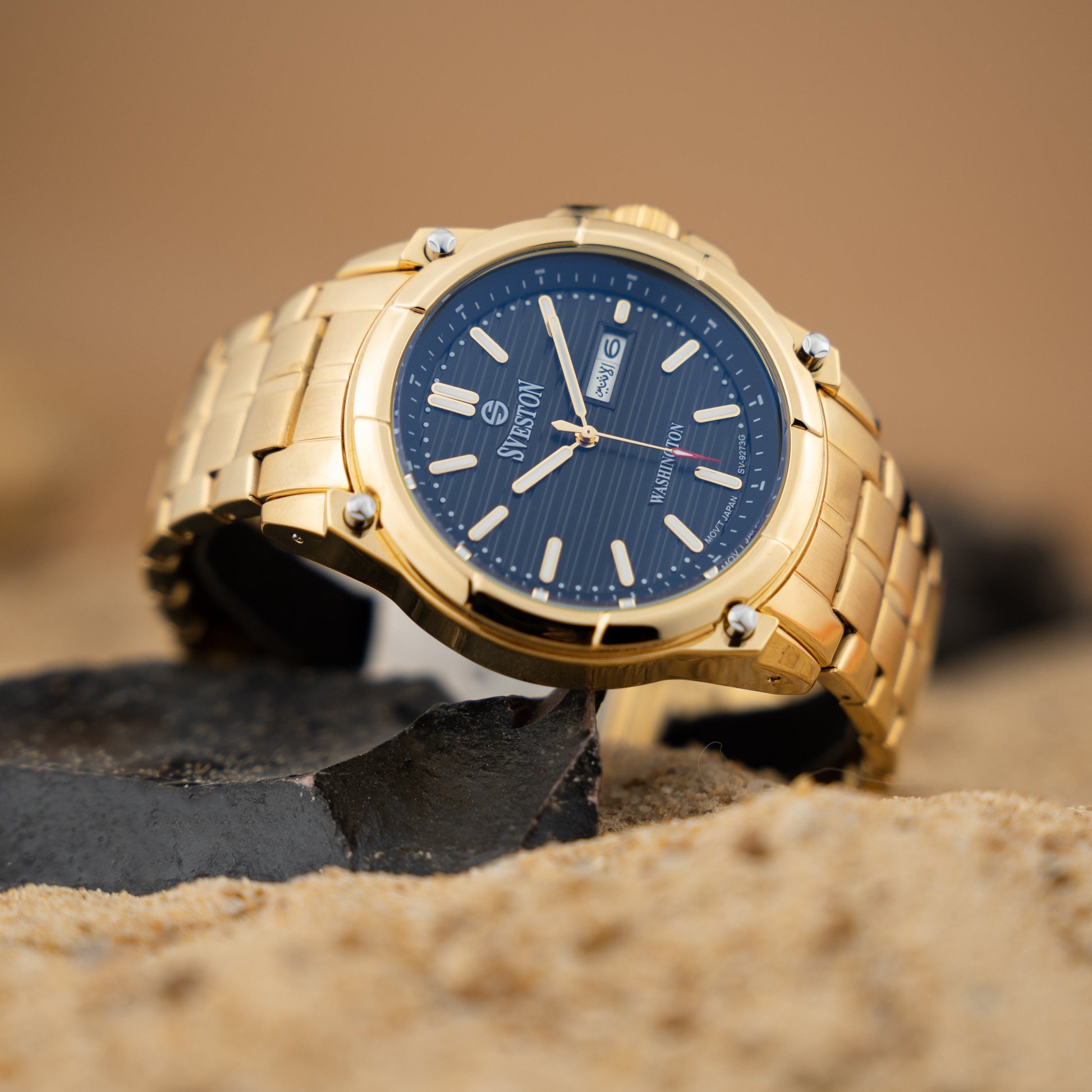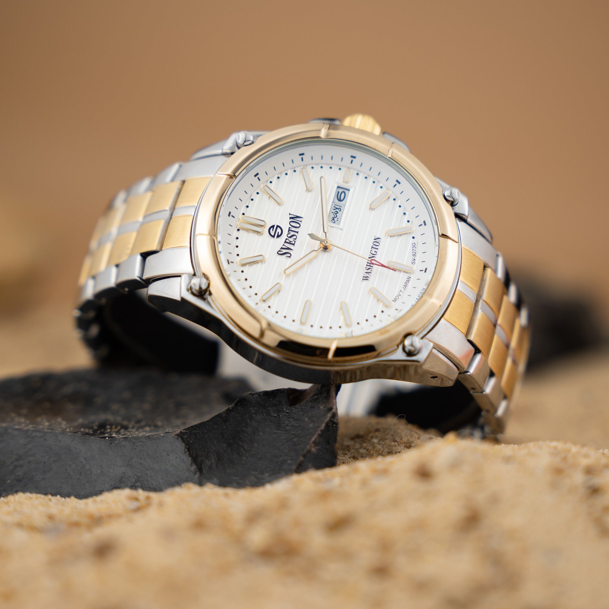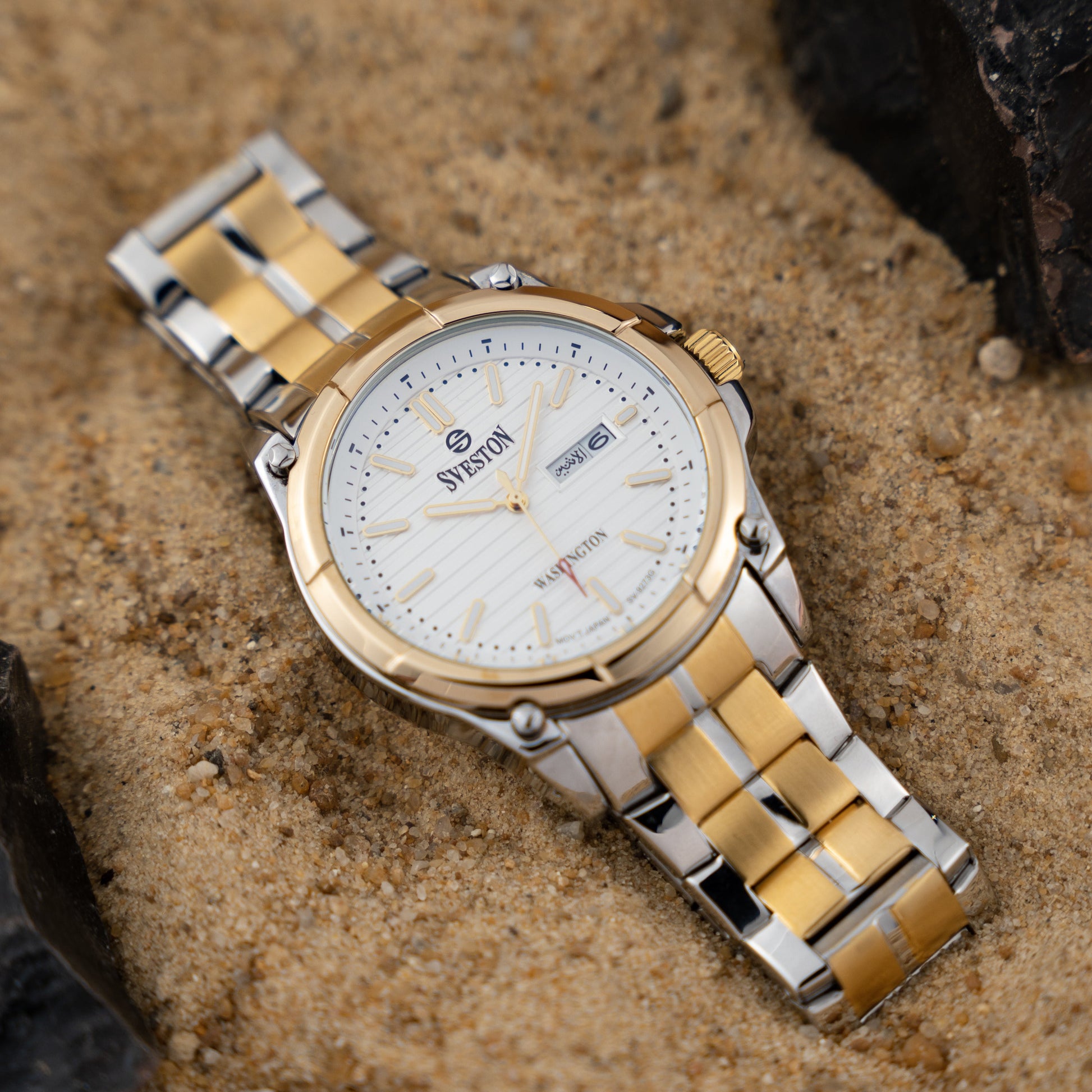 Sveston Stylish Washington analog battery powered 3 hand wrist watch features a 40mm round case on a Link Stainless Steel with Pushbutton Deployment Clasp Functions include hours minutes small seconds and date window on the Bottom this watch comes complete with luxury box and 1 year international warranty