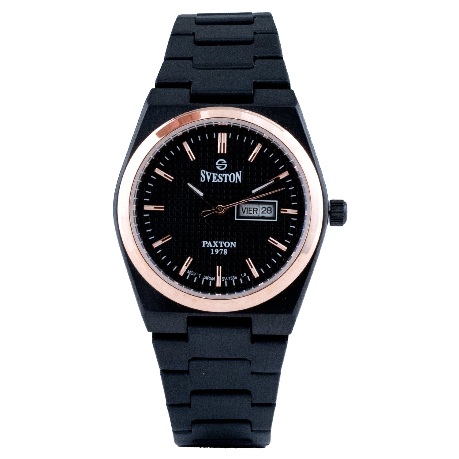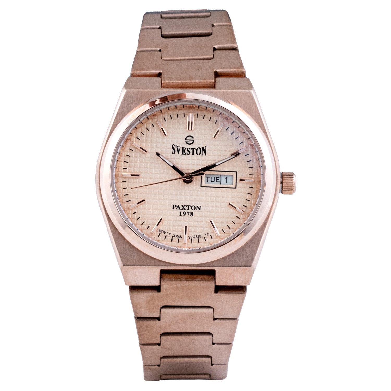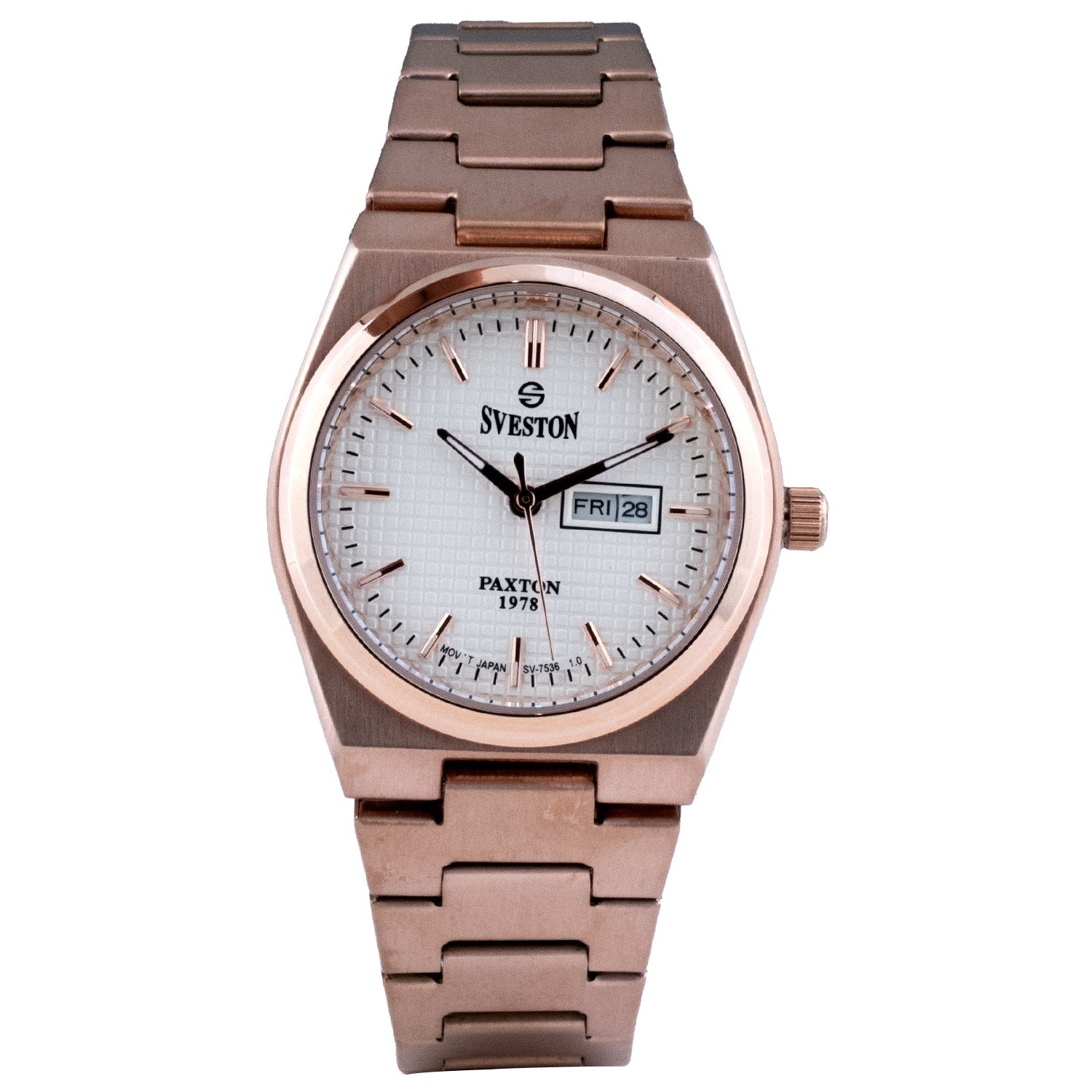 Sveston Paxton 1.0 is a Female Battery-Powered 3-Hand Wrist Watch showcases a sophisticated design with a 26mm round case complemented by a Stainless Steel featuring a Pushbutton Deployment Clasp It offers essential functionalities including hours minutes small seconds and a date window positioned on the right side this elegant timepiece comes packaged in a luxury box and includes a 1-year international warranty for added assurance.
